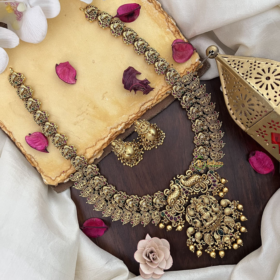 Gracefully adorn yourself with the Vriksham Dual Peacock Lakshmi Pendant Long Neckpiece. Handcrafted with gold beads, this piece features a stunning dual peacock design and a Lakshmi pendant. Elevate your style with this exclusive and elegant accessory.