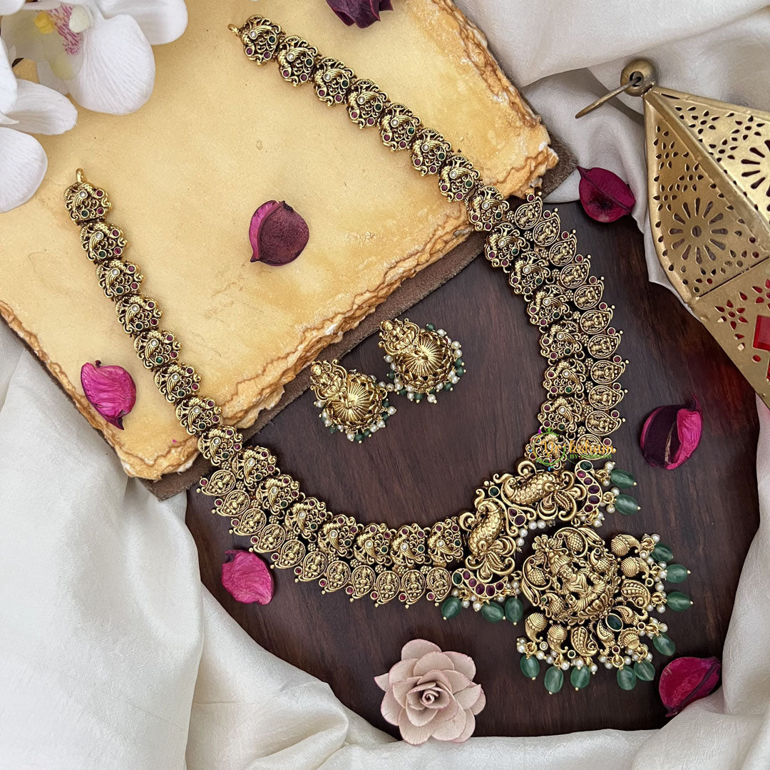 Gracefully adorn yourself with the Vriksham Dual Peacock Lakshmi Pendant Long Neckpiece. Handcrafted with pastel green beads, this piece features a stunning dual peacock design and a Lakshmi pendant. Elevate your style with this exclusive and elegant accessory.
