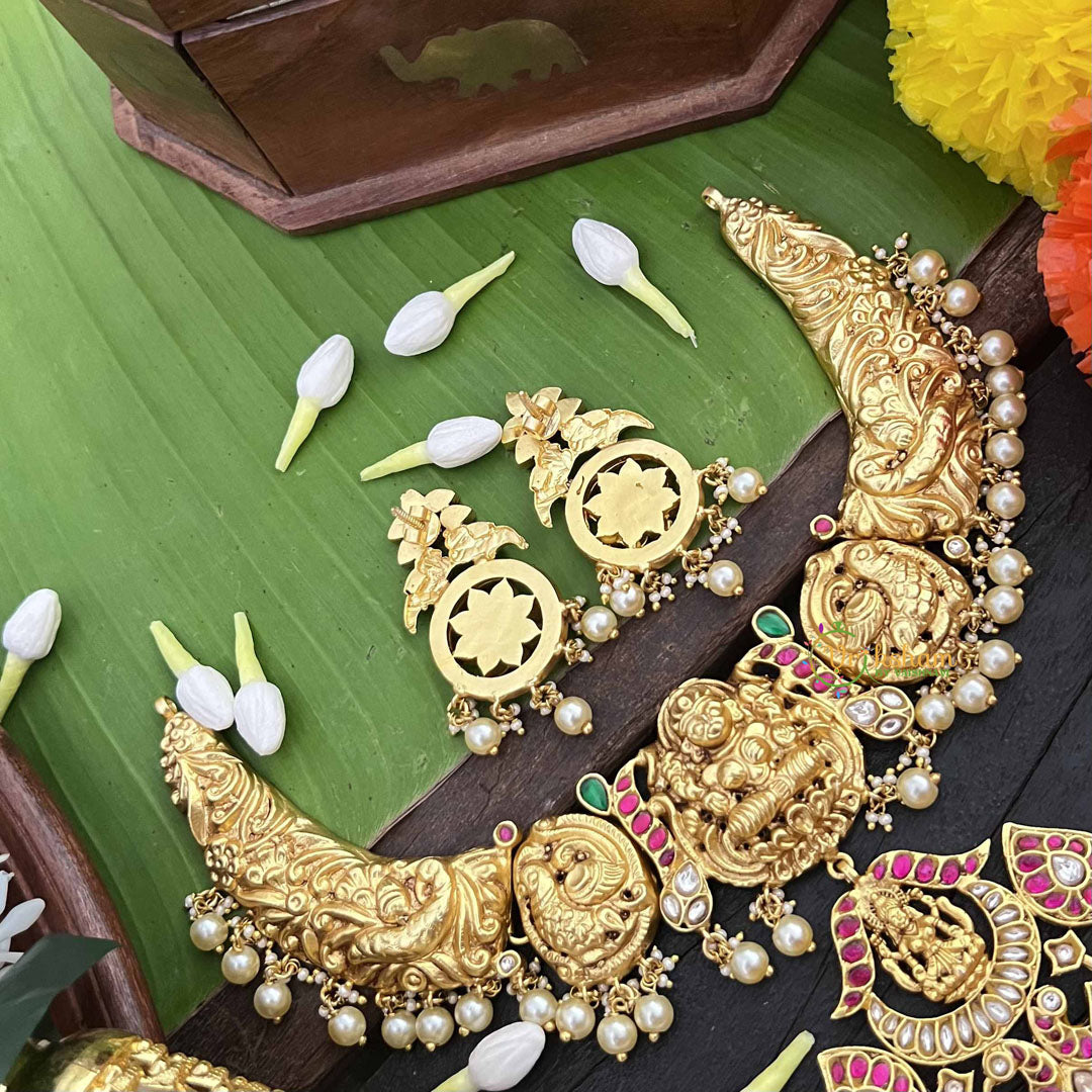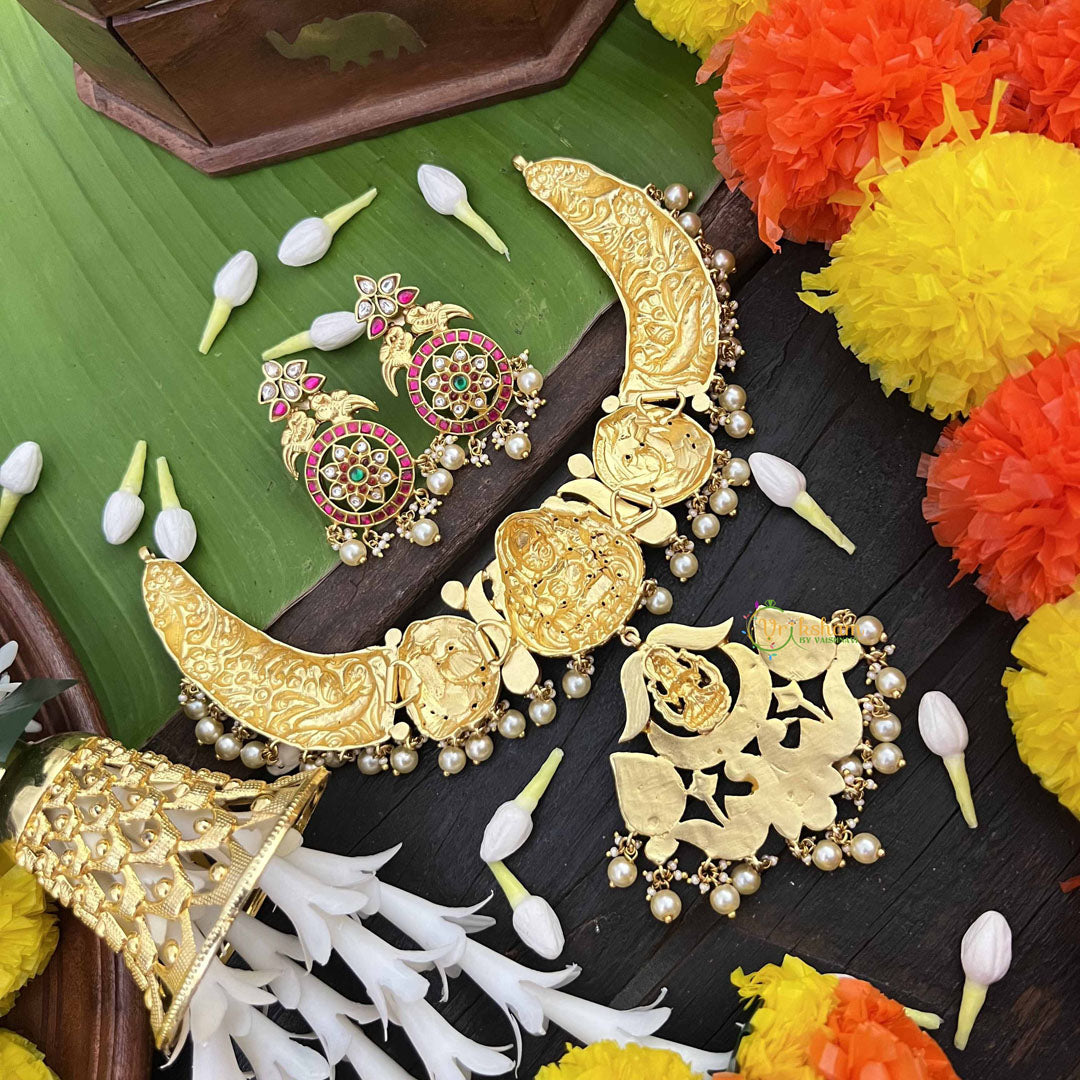 Unveil timeless sophistication with this exquisite Kundan Jadau short neckpiece, showcasing dual peacock and Lakshmi designs embellished with lustrous pearls. Crafted with meticulous attention to detail, radiant kundan stones are paired with creamy pearls to create an ethereal luminescence that captures light with every movement. This piece celebrates the convergence of prosperity and elegance, drawing from rich cultural symbolism and heritage craftsmanship. Ideal for weddings, religious ceremonies, and prestigious occasions, it serves as a statement of refined taste and spiritual reverence. A distinguished accessory that transcends trends, offering the wearer an heirloom-quality piece of unmatched beauty and cultural significance.