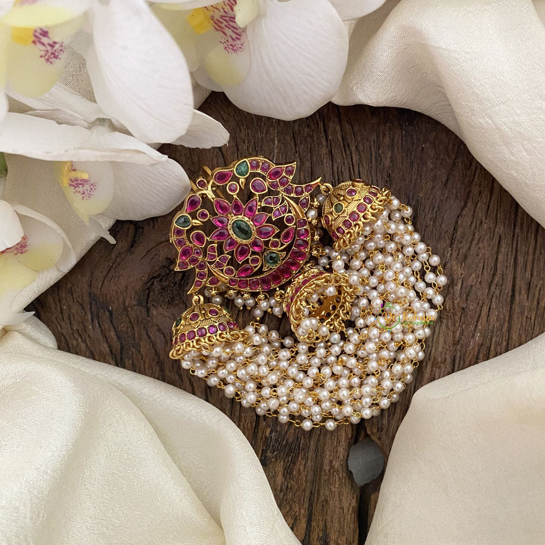 Elevate your hair game with our Vriksham Dual Peacock Pearl Bun Billai-Jada Billai-Red Green hair accessory. Two stunning peacock pearls adorn this unique piece, adding a touch of luxury and sophistication to your look. Perfect for special occasions or when you want to make a statement, this bun billai will surely turn heads.