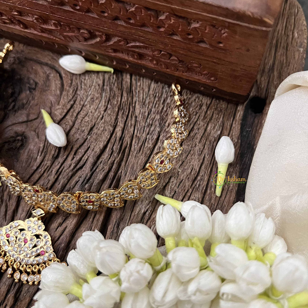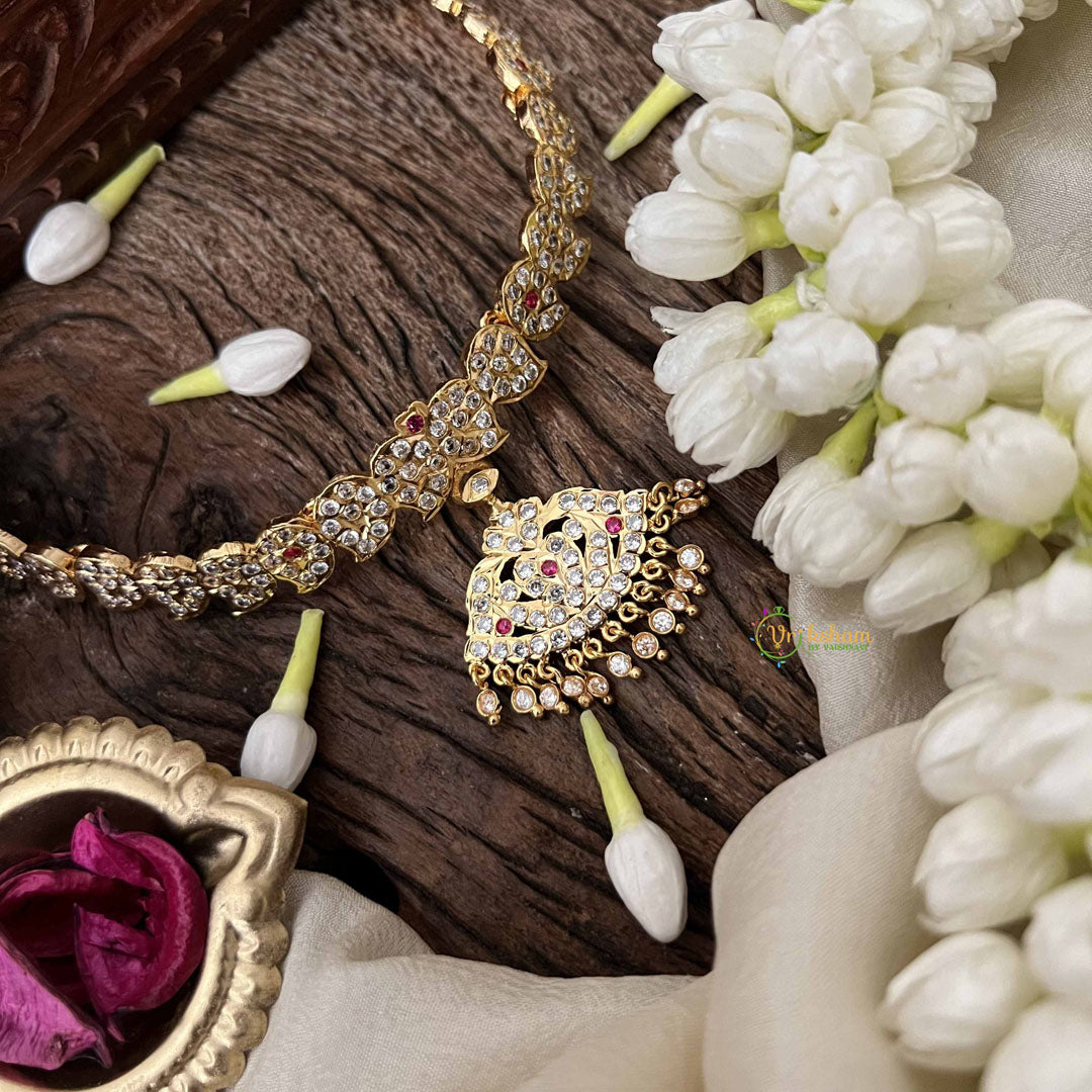 Indulge in timeless grandeur with this captivating dual peacock pendant neckpiece, where two elegant peacocks grace a pristine white canvas adorned with rich crimson red accents. The intricate manga detailing adds authentic traditional craftsmanship, while shimmering diamond drops frame the design with luminous brilliance. This short neckpiece epitomizes refined elegance, perfect for weddings, celebrations, and occasions demanding a striking presence. The symmetrical peacock composition symbolizes grace and devotion, creating a piece that transcends mere adornment to become a meaningful heirloom. Meticulously crafted to balance heritage artistry with contemporary sophistication, this neckpiece transforms any ensemble into a statement of distinguished taste and cultural appreciation.