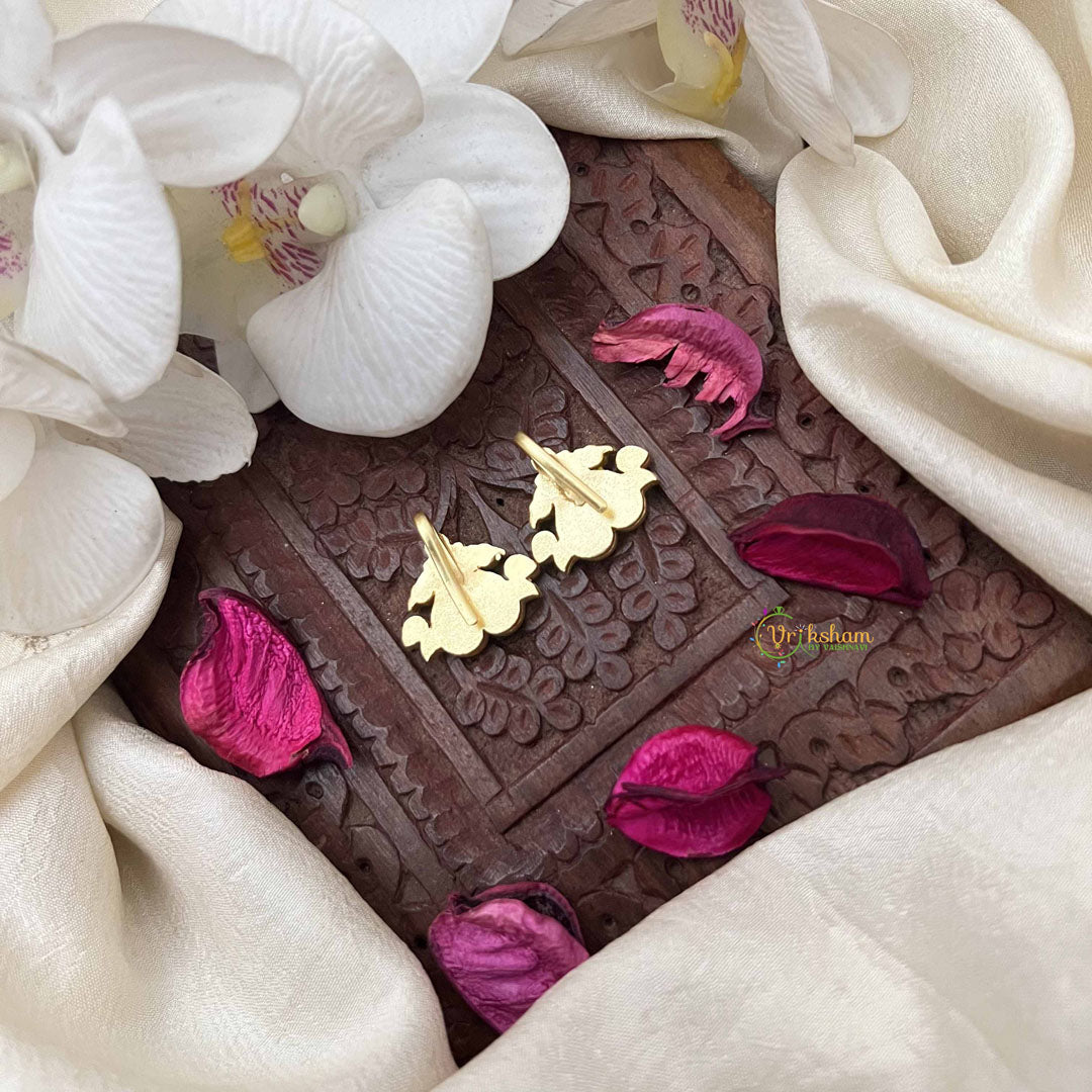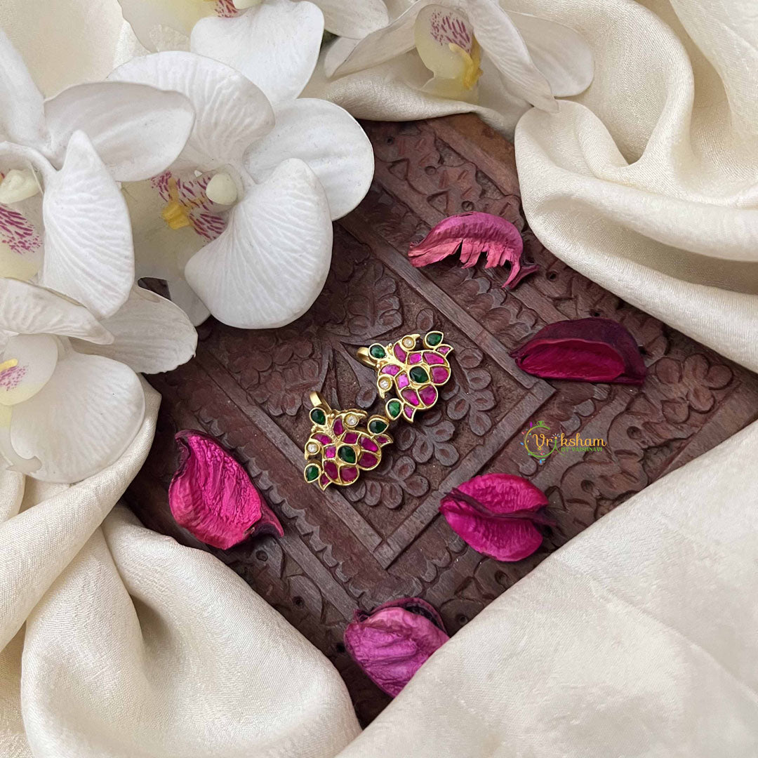 Embrace regal splendor with this magnificent dual peacock bugadi, a celebration of India's most iconic bird. This stunning piece features masterful kundan jadau work showcasing two graceful peacocks adorned with a vibrant palette of red, white, and green gemstones. The intricate detailing captures the majestic essence of these birds, while the gold-plated setting amplifies the brilliance of each carefully placed stone. The secure press mechanism provides comfortable, reliable wear for all-day elegance. Perfect for weddings, festivals, and grand celebrations, this bugadi represents the pinnacle of traditional Indian jewelry artistry. An extraordinary accessory that radiates opulence and cultural pride, destined to become a cherished heirloom that celebrates timeless beauty and heritage craftsmanship.