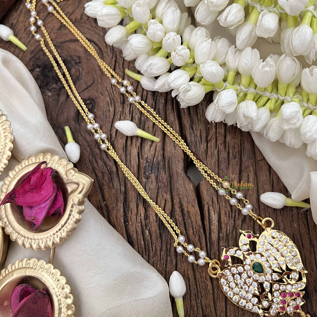 Indulge in extraordinary elegance with this magnificent Dual Peacock pendant, a celebration of symmetry and regal splendor. This exceptional piece features two intricately rendered peacocks in harmonious balance, adorned with brilliant AD stone embellishments and layered with two sumptuous tiers of lustrous pearls that create captivating dimension. The gold-plated setting radiates luxurious warmth, while the tricolor mala in white, red, and green represents the sacred principles of purity, divine love, and vitality. Meticulously designed for those who appreciate jewelry of exceptional artistry and profound meaning, this pendant becomes a powerful statement of grace and cultural reverence. Perfect for momentous occasions or as a treasured everyday companion, it embodies the qualities of confidence, beauty, and refined sophistication—a distinguished accessory that celebrates your appreciation for nature's most majestic creatures and your commitment to timeless, elegant living.