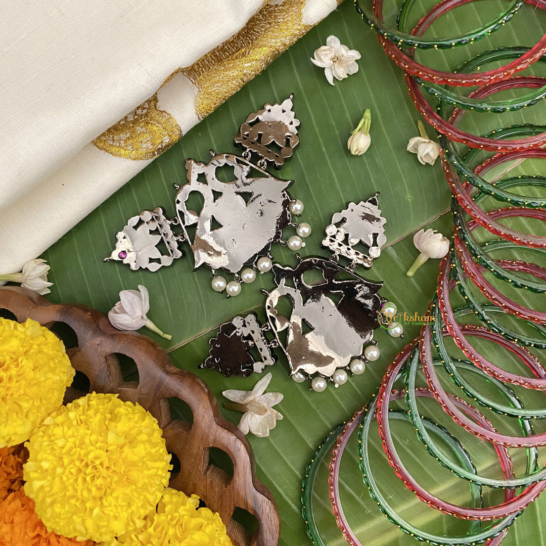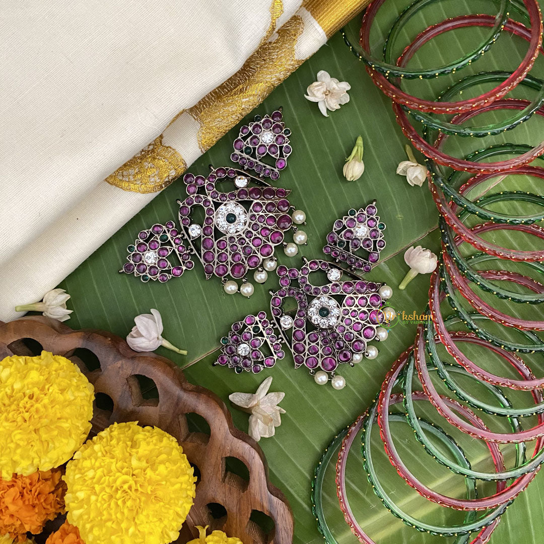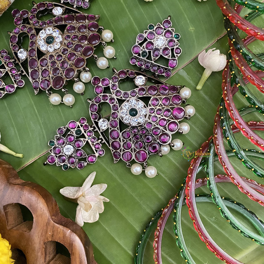 Introducing the Vriksham Dual Peacock Traditional Precious Kemp Vanki, a stunning addition to any jewelry collection. Crafted with intricate details and featuring precious kemp stones, this vanki symbolizes grace, elegance, and glamour. Make a statement and add a touch of luxury to your outfit with this exclusive piece.