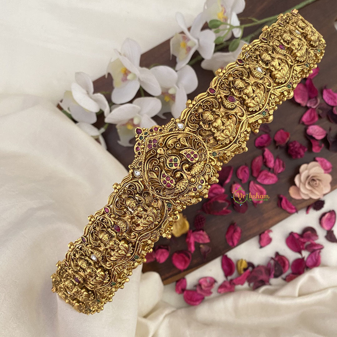 Introducing the Vriksham Dual Peacock With Lakshmi Bridal Hip Belt in stunning gold beads. This exquisite piece features dual peacock motifs, symbolizing grace and beauty, adorned with the goddess Lakshmi, representing wealth and prosperity. Elevate your bridal look with this luxurious, handcrafted hip belt.