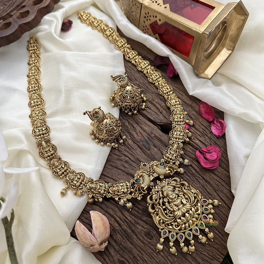 Elevate your style with the Vriksham Dual Peacock With Lakshmi Long Neckpiece. Crafted with intricate detail, this piece features mesmerizing peacock motifs and the goddess Lakshmi as a symbol of prosperity. Show off your unique taste and add a touch of elegance to any outfit with this luxury neckpiece.