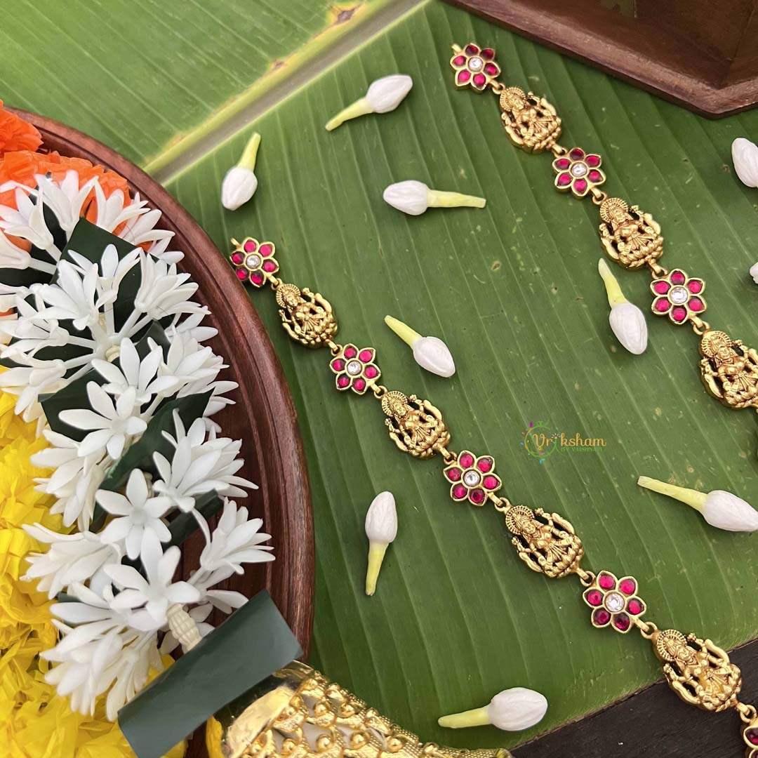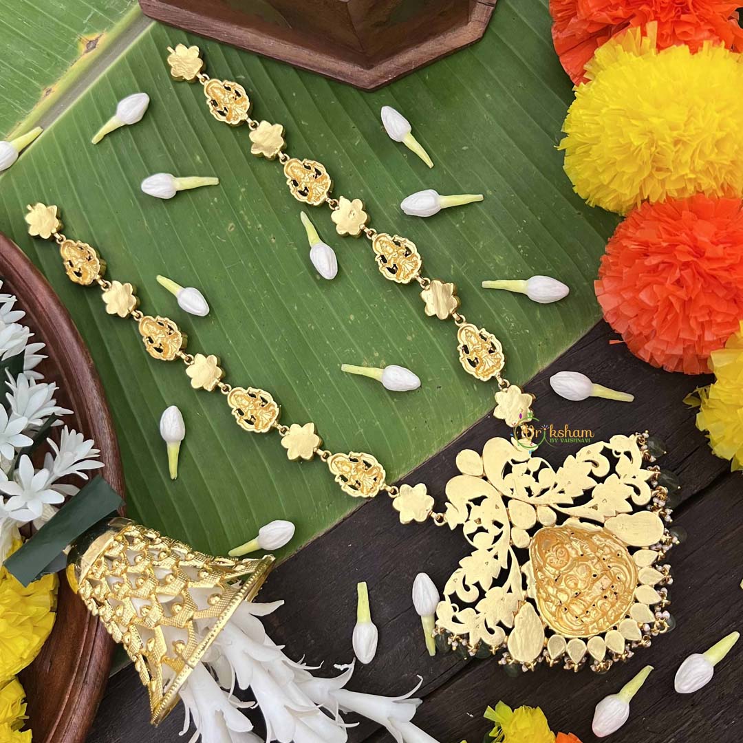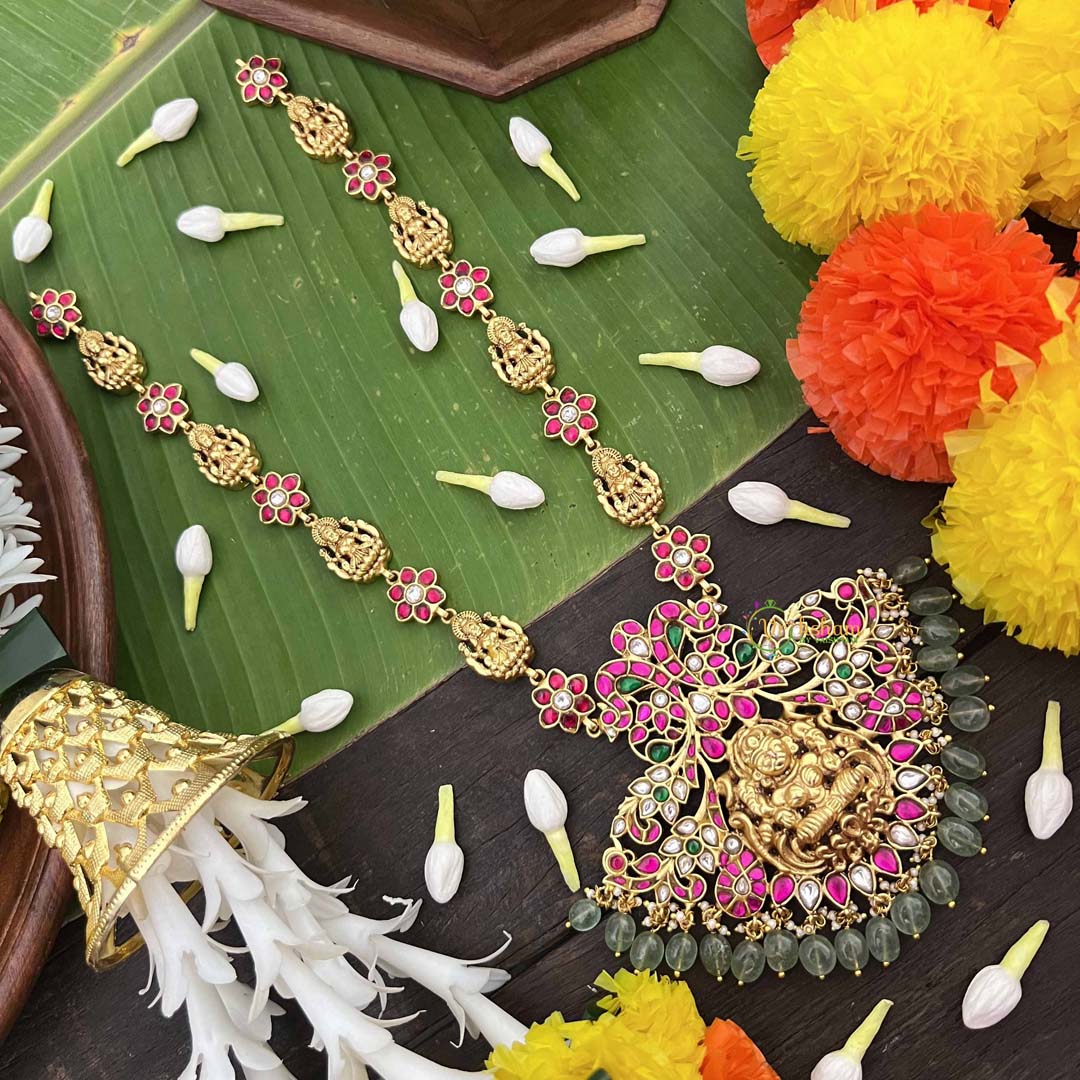 Experience unparalleled grandeur with this stunning long neckpiece showcasing a dual peacock and Lakshmi design, meticulously executed in traditional kundan jadau craftsmanship. The symmetrical peacock motifs frame the divine Lakshmi pendant, creating a balanced composition of spiritual significance and artistic brilliance. Adorned with luminous kundan stones and complemented by rich green beads, this piece commands attention with its elaborate detailing and luxurious presence. Ideal for milestone celebrations and prestigious occasions, it represents the pinnacle of Indian jewelry artistry. An heirloom-worthy treasure that seamlessly merges devotion, beauty, and timeless elegance.