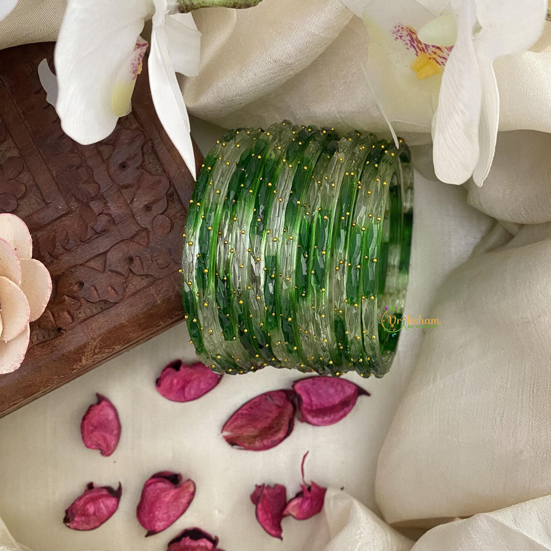 Enhance your wrists with these exquisite Off White & Green Color Glass Bangles. This set of 12 is crafted with premium glass, offering a lightweight and elegant feel. The bangles add a touch of luxury with their thin design, perfect for any occasion. Elevate your style with this stunning collection.