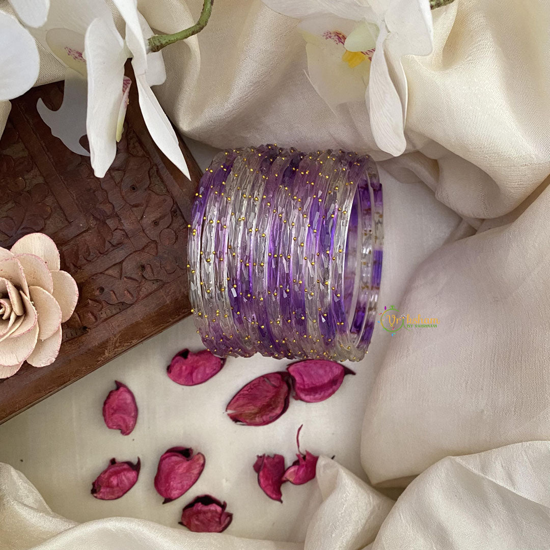 Enhance your wrists with these exquisite Off White & Light Purple Color Glass Bangles. This set of 12 is crafted with premium glass, offering a lightweight and elegant feel. The bangles add a touch of luxury with their thin design, perfect for any occasion. Elevate your style with this stunning collection.