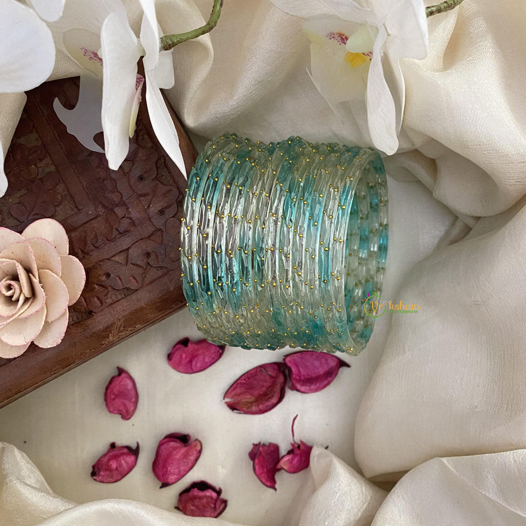 Enhance your wrists with these exquisite Off White & Sea Blue Color Glass Bangles. This set of 12 is crafted with premium glass, offering a lightweight and elegant feel. The bangles add a touch of luxury with their thin design, perfect for any occasion. Elevate your style with this stunning collection.
