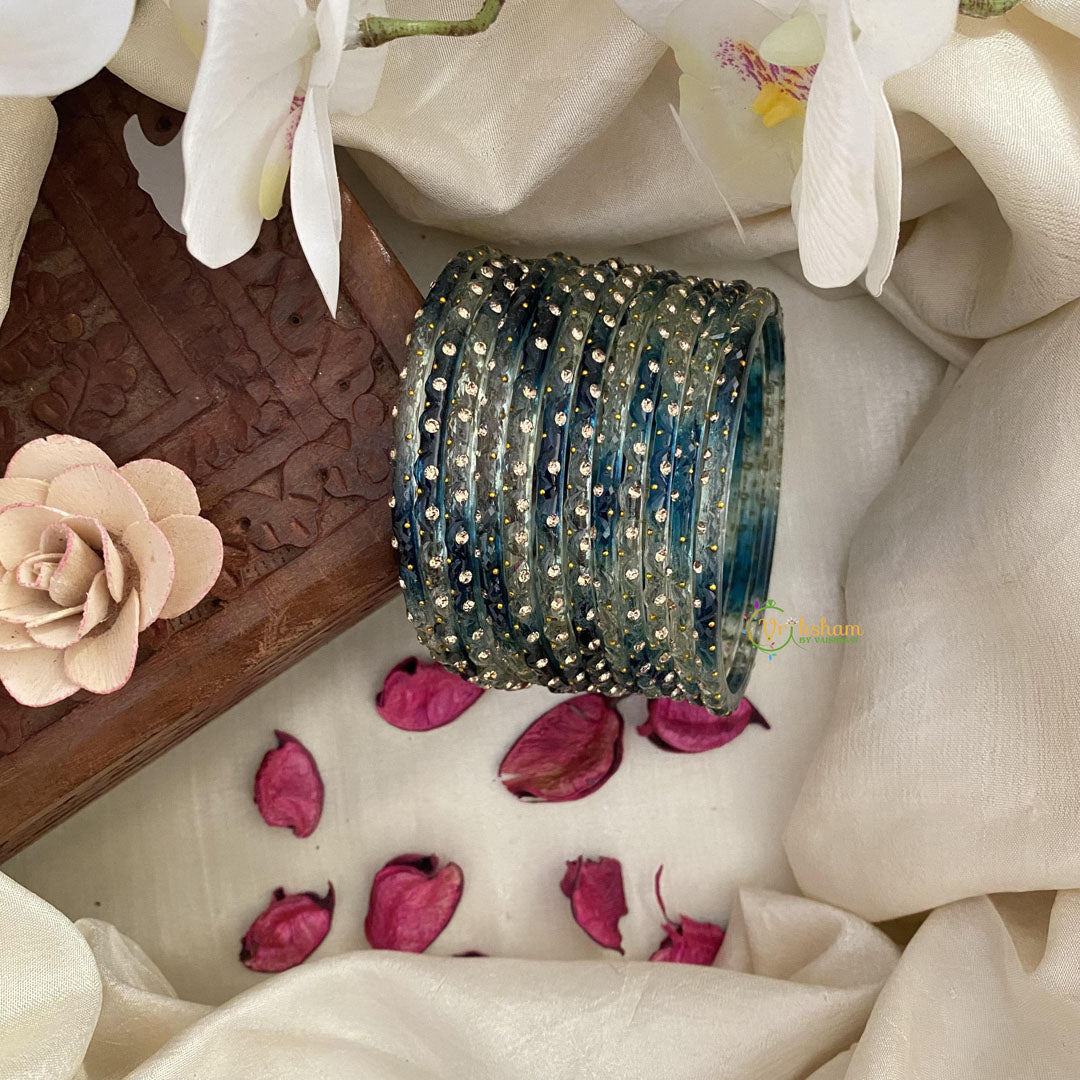 Indulge in luxury and sophistication with Vriksham's Dual Tone Moon Type Glass Bangles. This set of 12 features a stunning combination of off-white and aqua green, adding a touch of elegance to any outfit. Carefully crafted with premium glass, these bangles exude exclusivity and refinement.