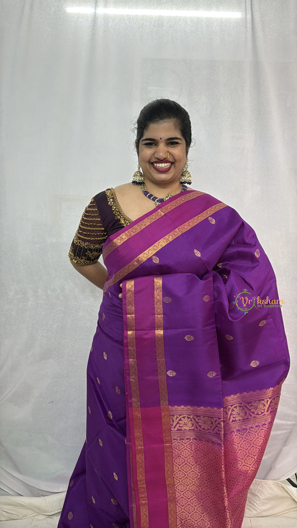 The Vriksham Dual-Tone Purple with Pink and Golden Floral Border Pure Soft Silk Saree combines rich purple and delicate pink hues for a refined look. Crafted from smooth, soft silk, it features an elegant golden floral border that enhances its sophisticated appeal. Ideal for special occasions, this saree offers graceful draping and a luxurious feel that ensures you stand out with timeless charm.