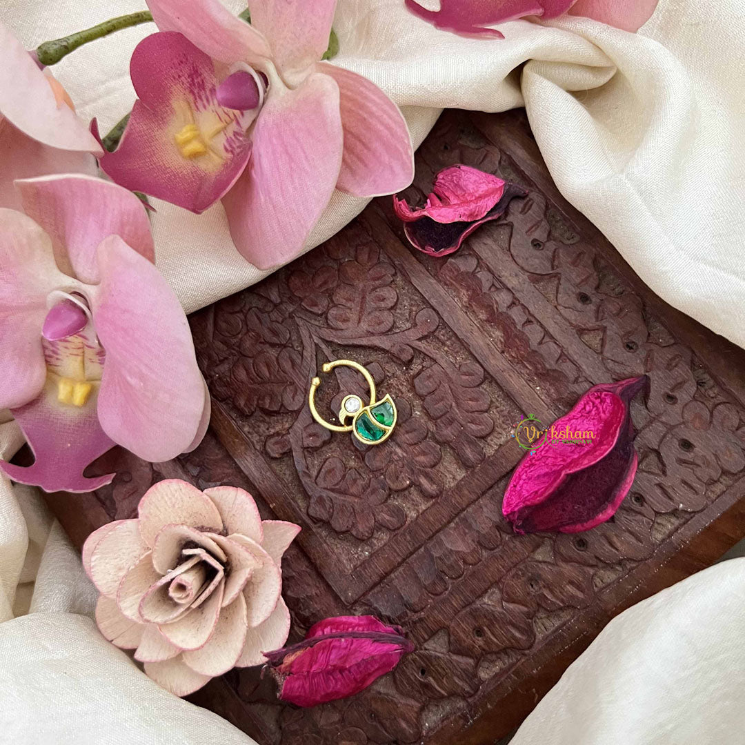 The Vriksham Duck Style Gold-Toned Kundan Jadau Septum Ring, featuring white and green accents, showcases meticulous kundan craftsmanship in a rich gold tone. This elegant piece offers a refined and graceful touch to traditional attire, perfect for enhancing your ethnic style with subtle sophistication.
