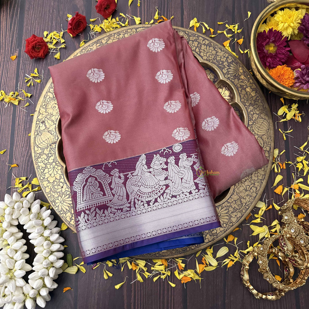Elevate your traditional wardrobe with the Vriksham Dusty Rose Kanchi Silk Saree, featuring a subtle dusty rose hue complemented by a refined silver zari palakku border. Crafted from premium Kanchi silk, this saree blends timeless elegance with delicate craftsmanship, making it perfect for festive occasions and formal events. The soft sheen and intricate border add a touch of sophistication, ensuring you stand out with grace and style.