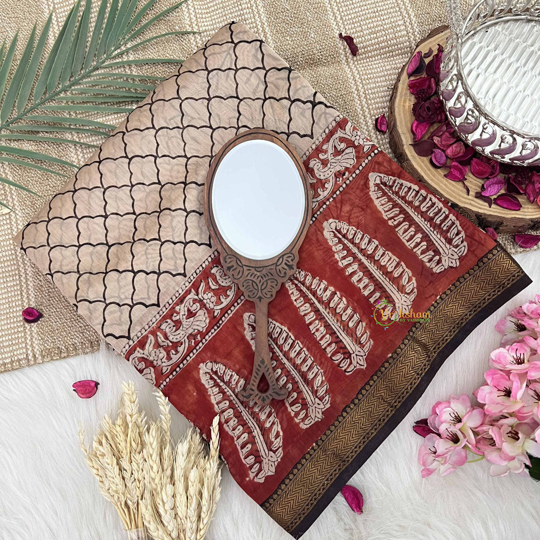 Celebrate geometric elegance with this Dutch White & Red Square Maheshwari silk cotton saree, a contemporary interpretation of traditional weaving artistry. Expertly handwoven from premium silk-cotton fabric, this saree features bold square motifs in vibrant red punctuating a clean white base, creating a striking visual composition that commands attention. The modern geometric pattern paired with classic Maheshwari construction offers a distinctive aesthetic that bridges heritage and contemporary style. The lightweight, breathable weave ensures comfort and graceful movement, while the structured drape enhances your silhouette with effortless sophistication. Each piece embodies the meticulous skill of master weavers, making this saree an exceptional choice for those seeking authentic handloom textiles that reflect both artistic vision and timeless appeal.