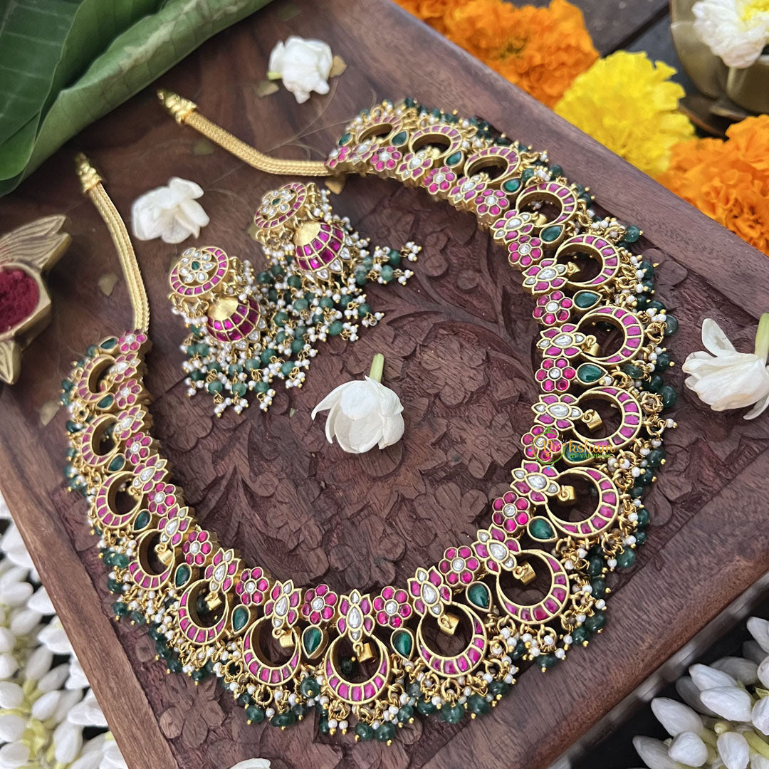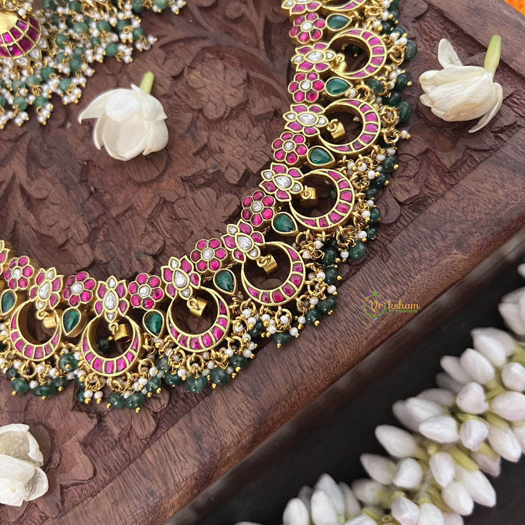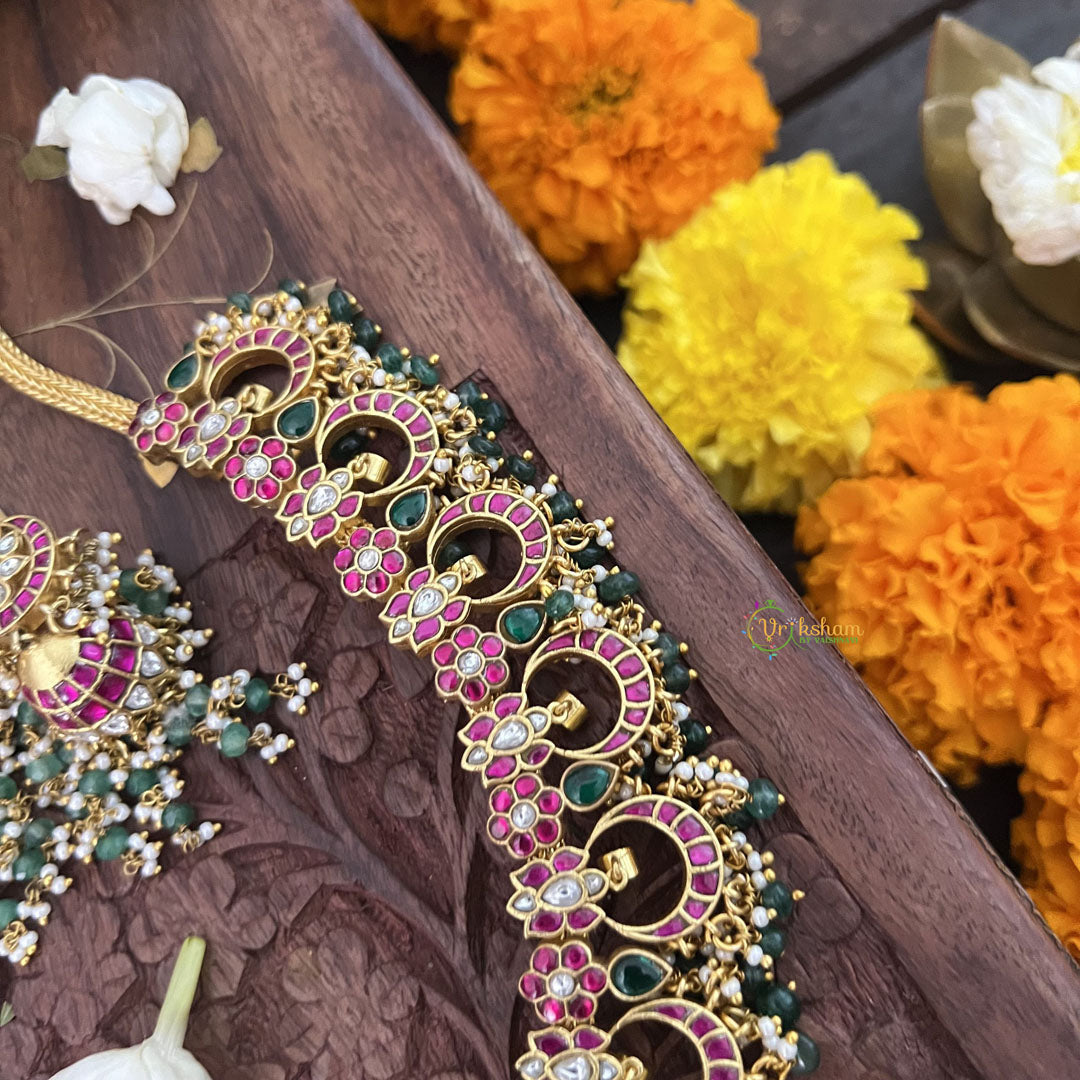 The Vriksham Elegant 17 Half Moon Neckpiece combines a unique crescent silhouette with delicate floral motifs, enhanced by vibrant green beads. This sophisticated design offers a graceful balance of tradition and modernity, perfect for adding a refined touch to any ensemble.