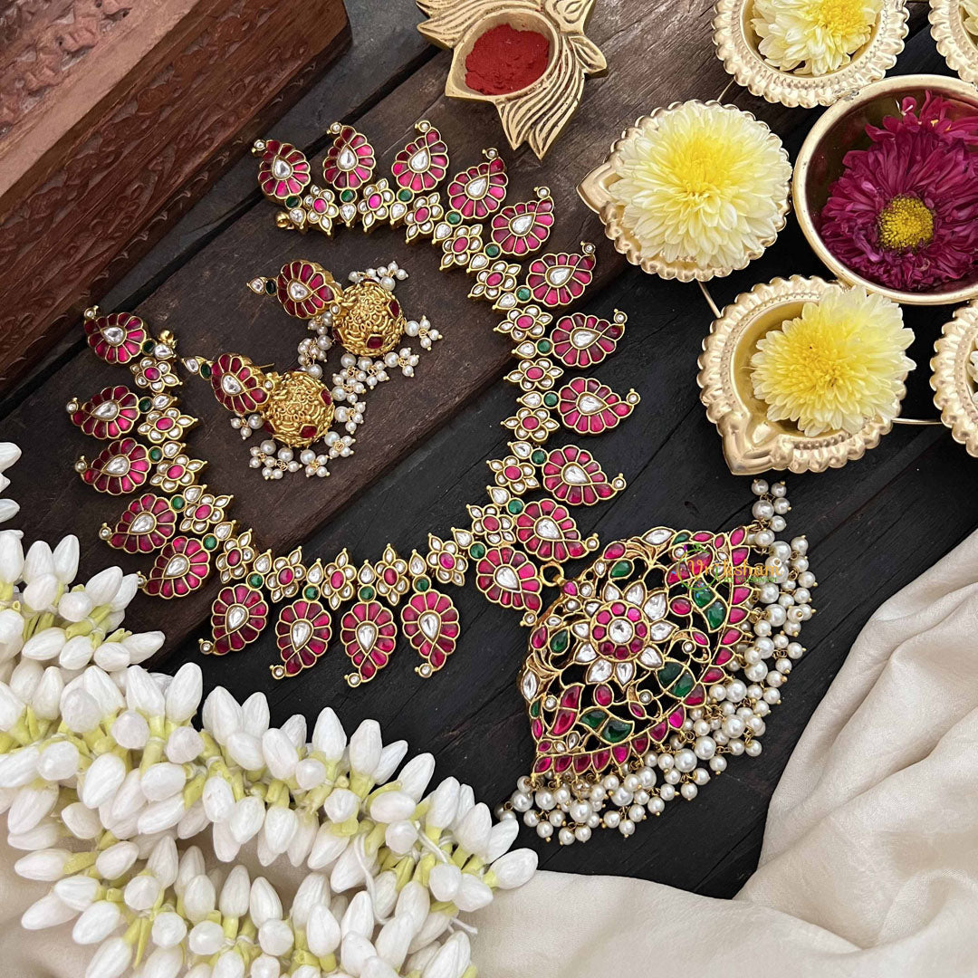 Experience timeless elegance with this 20 manga Kundan Jadau neckpiece, featuring a graceful floral pendant design. Adorned with red, green, and white stones accented by shimmering pearls, this piece enhances traditional ensembles with refined charm and sophistication.