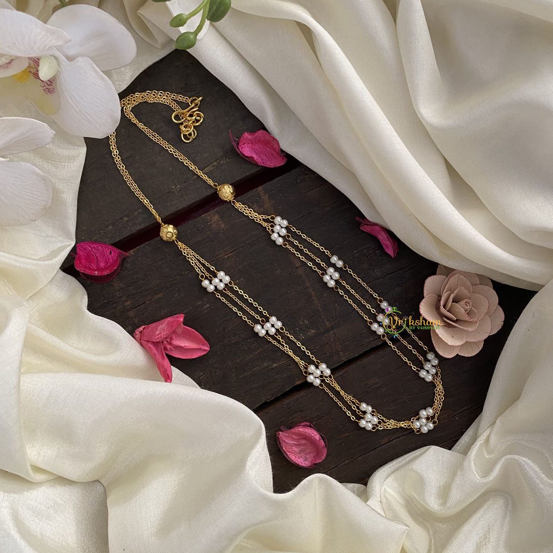 Indulge in luxury and elegance with the Vriksham Elegant 3 Layer Pearl Mala. Crafted with precision and adorned with lustrous pearls, this mala exudes sophistication. The triple layer design adds a touch of opulence to any outfit. Elevate your style with this exclusive piece, fit for the most discerning tastes.