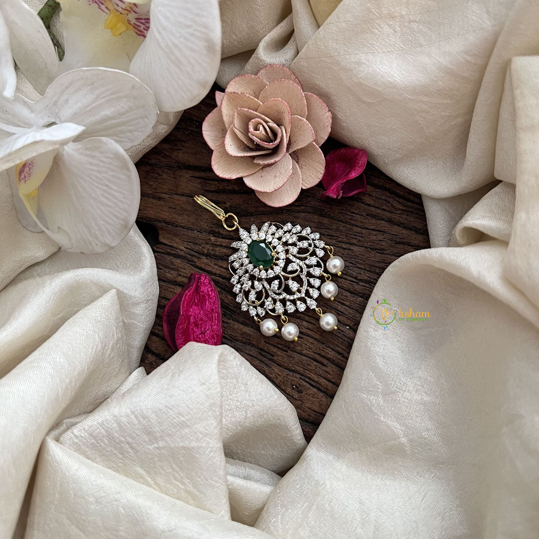The Vriksham Elegant AD Stone Maang Tikka features a refined design adorned with sparkling AD stones, vibrant green accents, and delicate pearls. This sophisticated piece adds a graceful and timeless touch to traditional attire, perfect for enhancing your look with subtle elegance on special occasions.