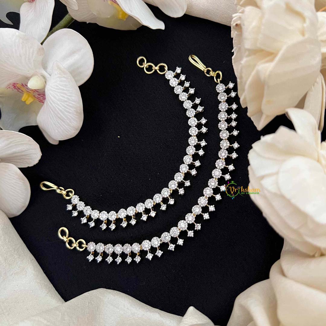 Embrace understated elegance with these refined ear chains, featuring dainty round-cut American diamond crystals that sparkle with pristine brilliance. Designed for the discerning wearer, these maatil pieces showcase minimalist sophistication with maximum impact, allowing the luminous gemstones to take center stage. The delicate construction drapes gracefully along the ear, creating an ethereal and refined silhouette. Perfect for both special occasions and elevated everyday wear, these crystal ear chains add a whisper of luxury to any look, embodying timeless grace and contemporary sensibility.