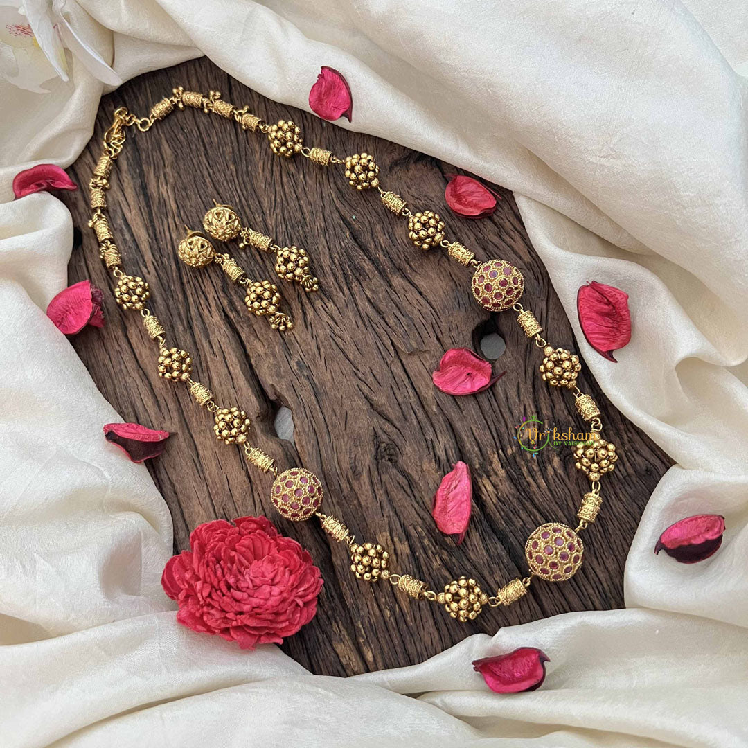 The Vriksham Elegant Antique Gold Ball With Red Ruby Circle Beaded Neckpiece features a graceful circle of red ruby beads encircled by antique gold balls, showcasing refined craftsmanship. This sophisticated design adds timeless elegance to any ensemble, making it an ideal choice for special occasions and formal events.