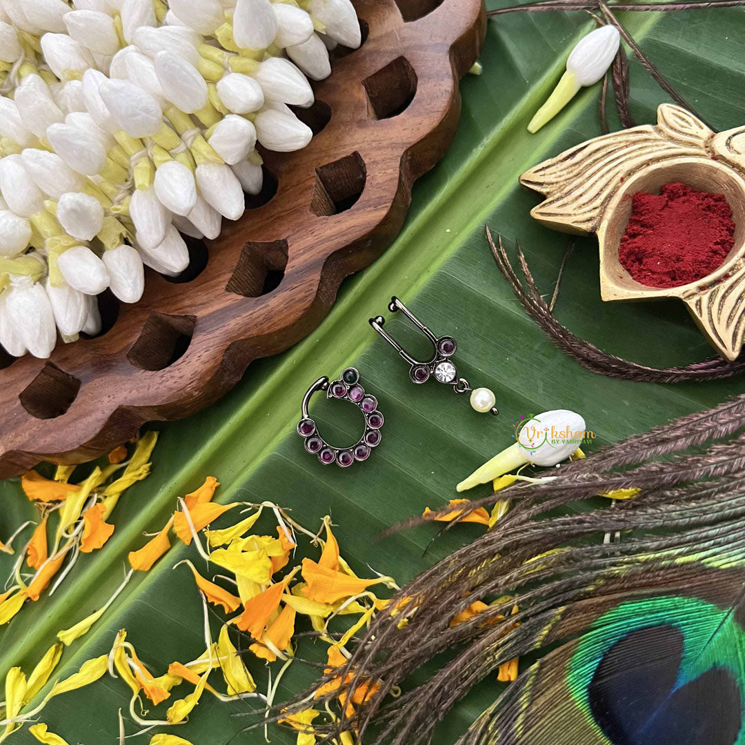 Experience timeless grace with the Elegant Black Polish Precious Kemp Nath paired with Bullaku adorned in red, green, and pearl accents. The striking black polish highlights the vibrant Kemp stones, while the delicate pearls add a touch of refined elegance. This exquisite set blends traditional artistry with modern sophistication, perfect for enhancing any special occasion ensemble.
