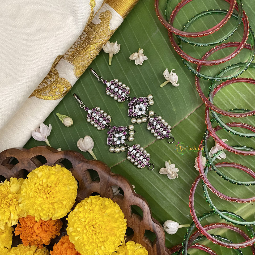 Introducing the Vriksham Elegant Black Polish Traditional Precious Kemp Maatil-Pearl. Exquisitely crafted with traditional techniques and adorned with precious kemp stones and lustrous pearls. Complete your look with this opulent piece, perfect for special occasions and cultural celebrations.
