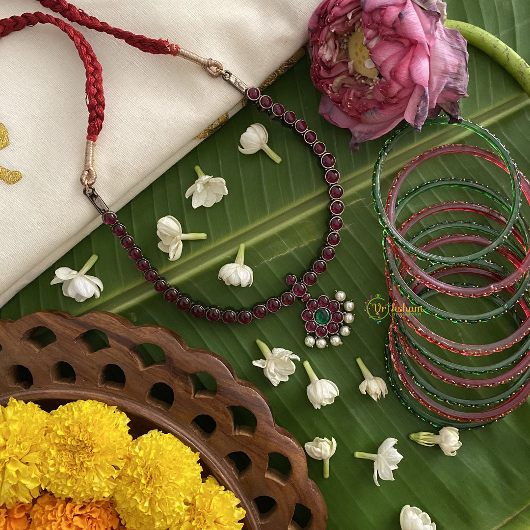 Elevate your style with the Vriksham Elegant Black Polish Traditional Precious Kemp Short Neckpiece-Pearl. Crafted with black polish and adorned with precious kemp and pearl accents, this neckpiece exudes elegance and sophistication. Perfect for adding a touch of luxury to any outfit.