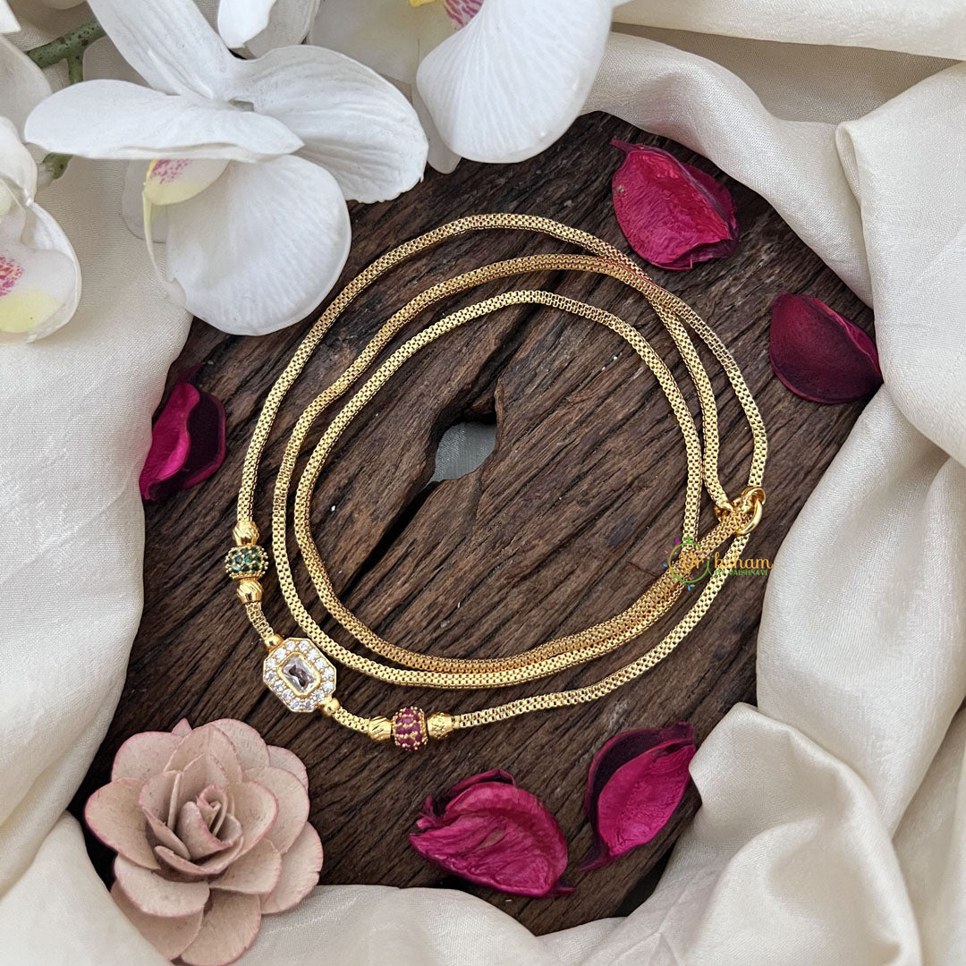 Elevate your everyday style with the Vriksham Elegant Daily Wear Gold Chain, featuring delicate white stones and vibrant red and green mogappu accents. This finely crafted piece blends traditional charm with modern elegance, making it perfect for daily wear while adding a subtle touch of sophistication to any outfit.