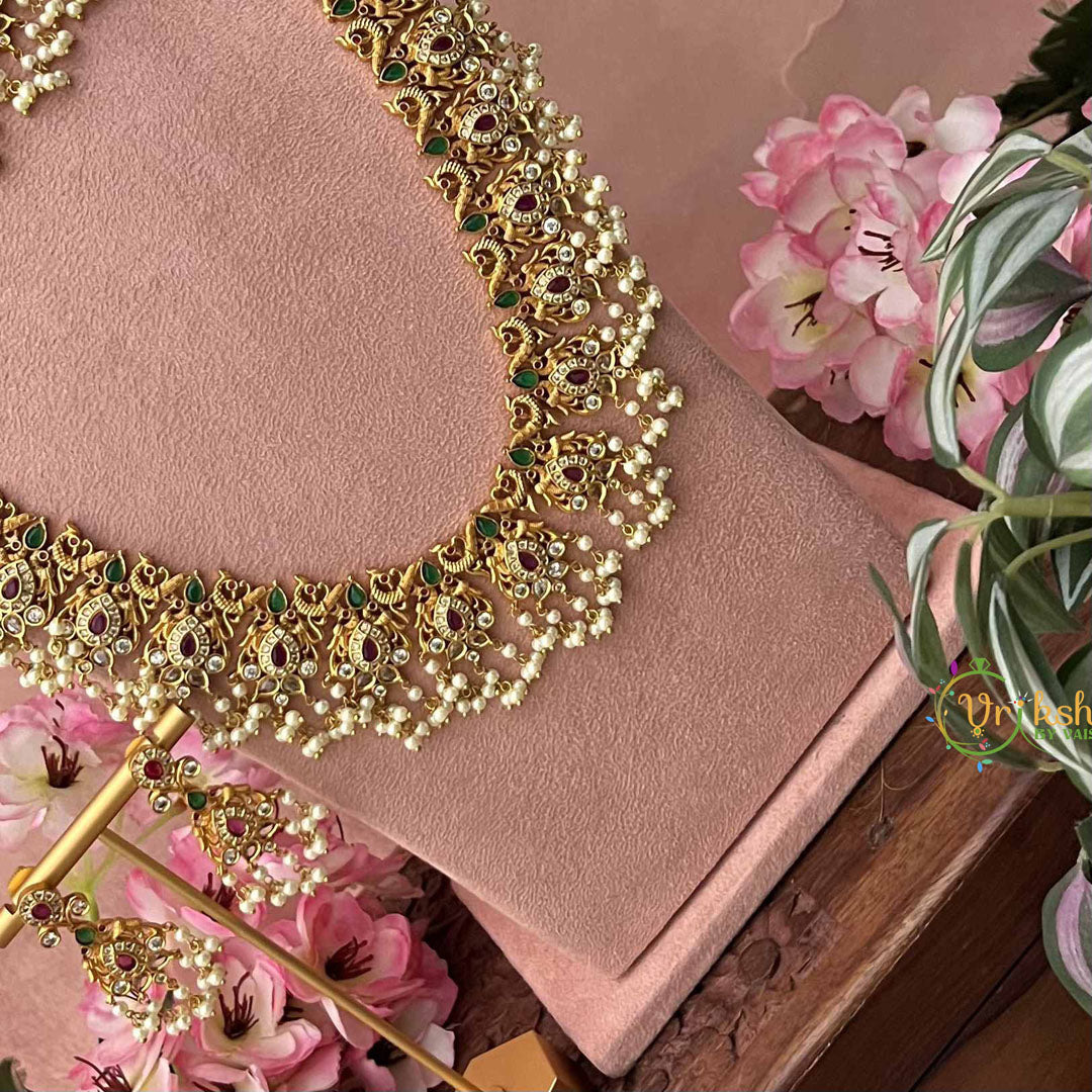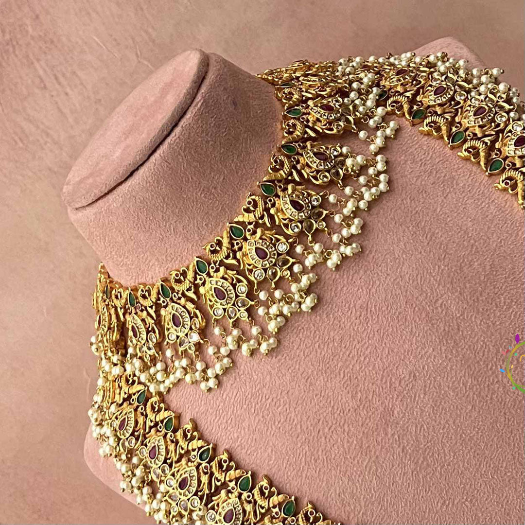 This elegant bridal set captures the essence of traditional artistry with its distinctive Diya-inspired silhouette. The harmonious blend of white, green, and red hues creates a vibrant yet refined aesthetic that honors cultural heritage. Lustrous pearls are intricately woven throughout the design, enhancing its luminous quality and visual depth. Crafted with meticulous Guttapusalu technique, each piece reflects exceptional artisanal skill and attention to detail. An ideal selection for brides seeking a statement piece that gracefully marries tradition with contemporary elegance.