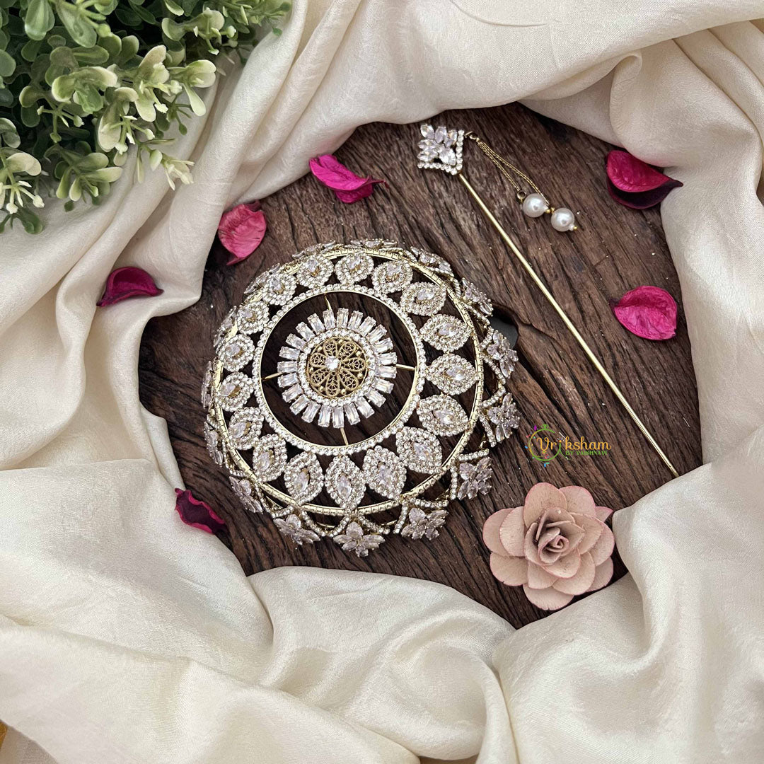 The Vriksham Elegant Floral Crystal with Pearl Coated Design Hair Bun Cage Accessory offers a graceful blend of shimmering crystals and lustrous pearls. This refined accessory gracefully secures your bun while adding a sophisticated floral touch, perfect for enhancing bridal or formal hairstyles with subtle luxury and timeless beauty.