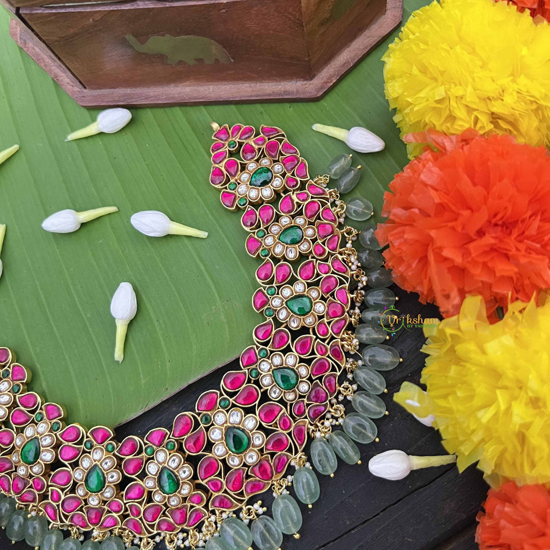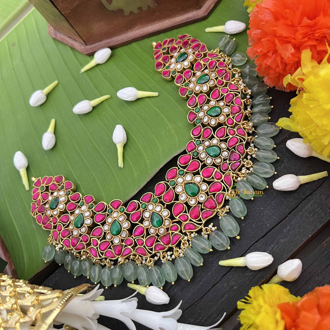 Experience the allure of heritage jewelry with this sophisticated Kundan Jadau short neckpiece, meticulously crafted to capture timeless elegance. Featuring delicate floral designs embellished with radiant kundan stones, each piece showcases exceptional artisanal skill. The serene aqua green beads complement the ornate detailing, creating a harmonious balance of color and craftsmanship. Ideal for weddings, celebrations, and formal occasions, this neckpiece embodies refined taste and cultural richness. A treasured accessory that celebrates traditional artistry while making a graceful statement of sophistication.