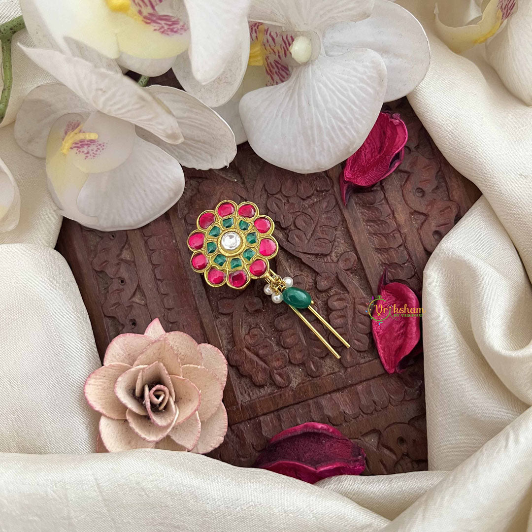 The Vriksham Elegant Floral Kundan Jadau Jada Billai features a refined floral design adorned with red, green, and white stones, complemented by a striking green bead. This sophisticated piece enhances traditional hairstyles with its graceful details and meticulous craftsmanship, making it an ideal accessory for weddings and festive celebrations.
