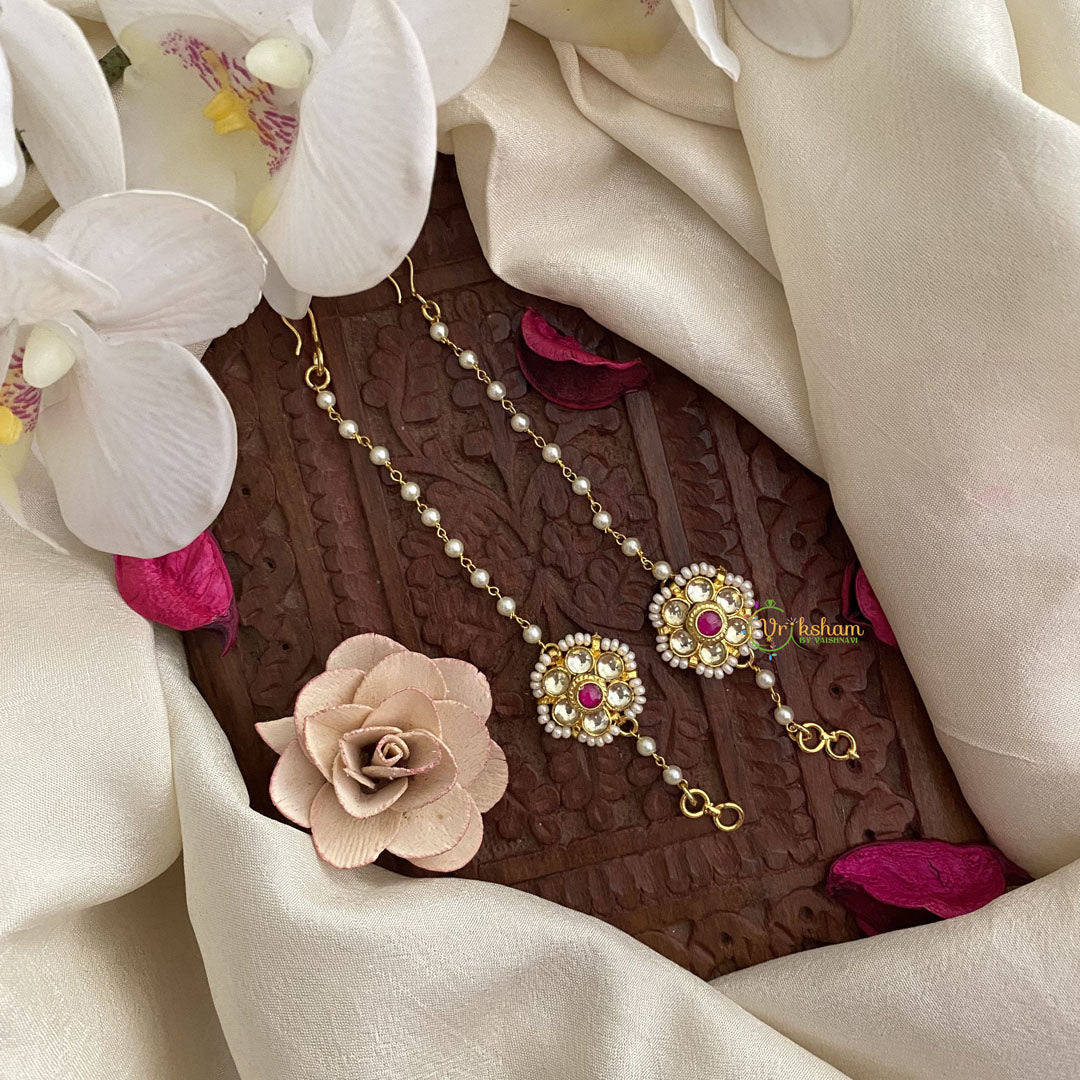 Indulge in luxury with our Vriksham Elegant Floral Maatil. Featuring a single strand of lustrous white pearls adorned with red and white stones in a floral design, this piece is truly one-of-a-kind. Elevate any outfit with this sophisticated and exclusive accessory.