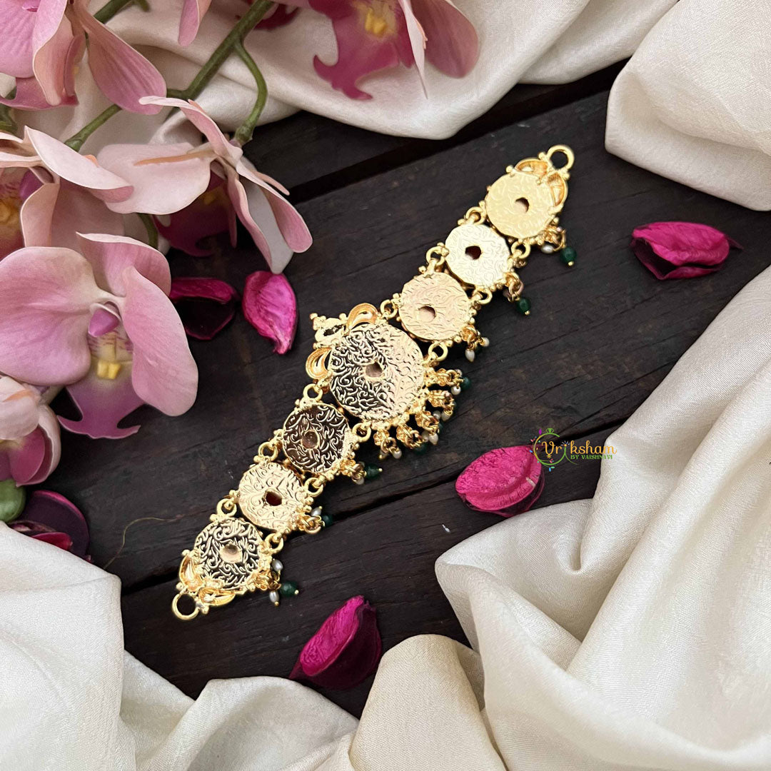 Radiate understated luxury with this elegant floral choker, a refined interpretation of traditional South Indian jewelry design. Embellished with shimmering AD stones that catch the light beautifully, this piece features intricate floral motifs rendered in 1 gm gold. The verdant green beads provide a sophisticated contrast, enhancing the overall aesthetic with natural warmth. Designed as a close-fitting choker, it frames the neckline with graceful botanical elegance, perfect for festive celebrations, temple occasions, or elevating your formal attire. The meticulous craftsmanship and timeless floral pattern make this neckpiece a versatile treasure that transcends seasons and occasions, embodying the refined sensibility of heritage jewelry.