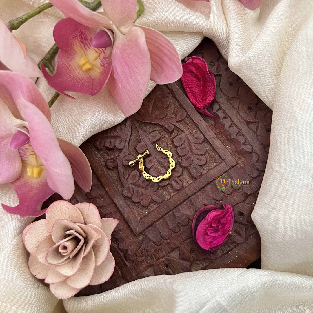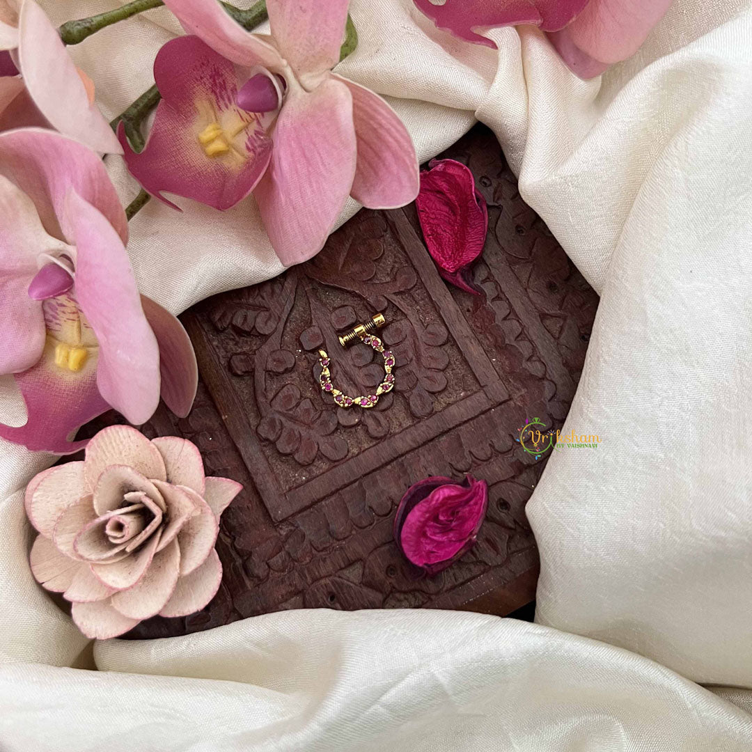 The Vriksham Elegant Floral Style Press Nose Pin in vibrant red showcases intricate floral detailing paired with a user-friendly press-fit design. This refined piece adds a sophisticated splash of color, perfect for enhancing your look with subtle grace on any occasion.