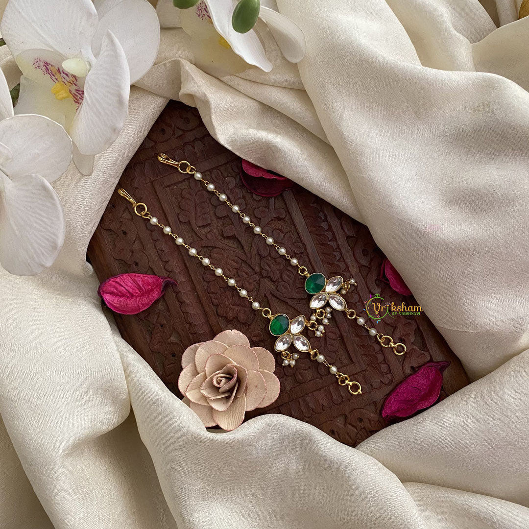 Indulge in the timeless elegance of Vriksham's Elegant Floral Maatil. With delicate white pearls and striking green stones woven into a single strand, this piece exudes sophistication and luxury. Don't settle for ordinary, elevate your style with the exquisite beauty of this accessory.