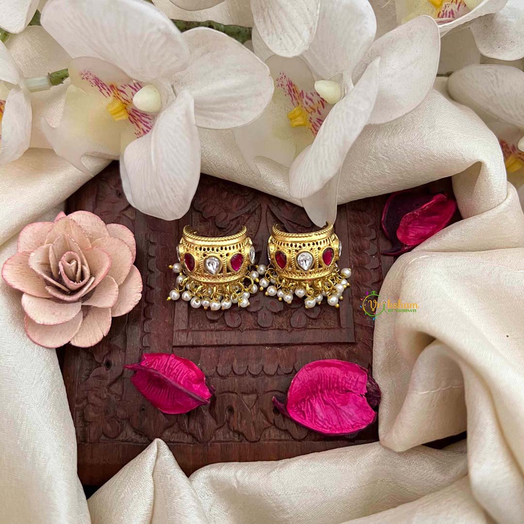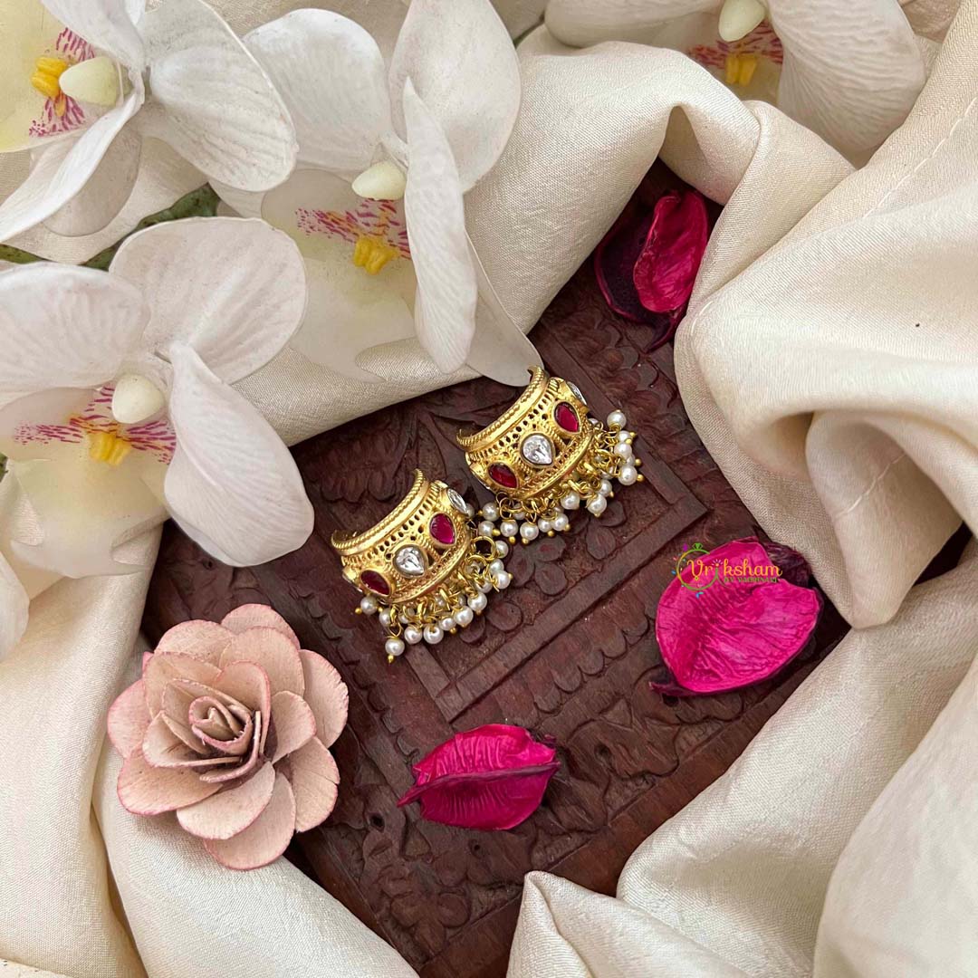 Experience the pinnacle of artisanal jewelry craftsmanship with these magnificent kundan jadau earrings, where lustrous pearl clusters cascade from intricately adorned gold frameworks. The mismatched bugadi design showcases a captivating tricolor palette—rich red, pristine white, and verdant green—creating a dynamic visual composition that celebrates Indian heritage. Each asymmetrical piece demonstrates meticulous gemstone setting and traditional jadau techniques, offering a statement of refined elegance. Ideal for weddings, festivals, and momentous celebrations, these handcrafted treasures blend cultural authenticity with contemporary sophistication, ensuring you radiate timeless grace and distinctive style.