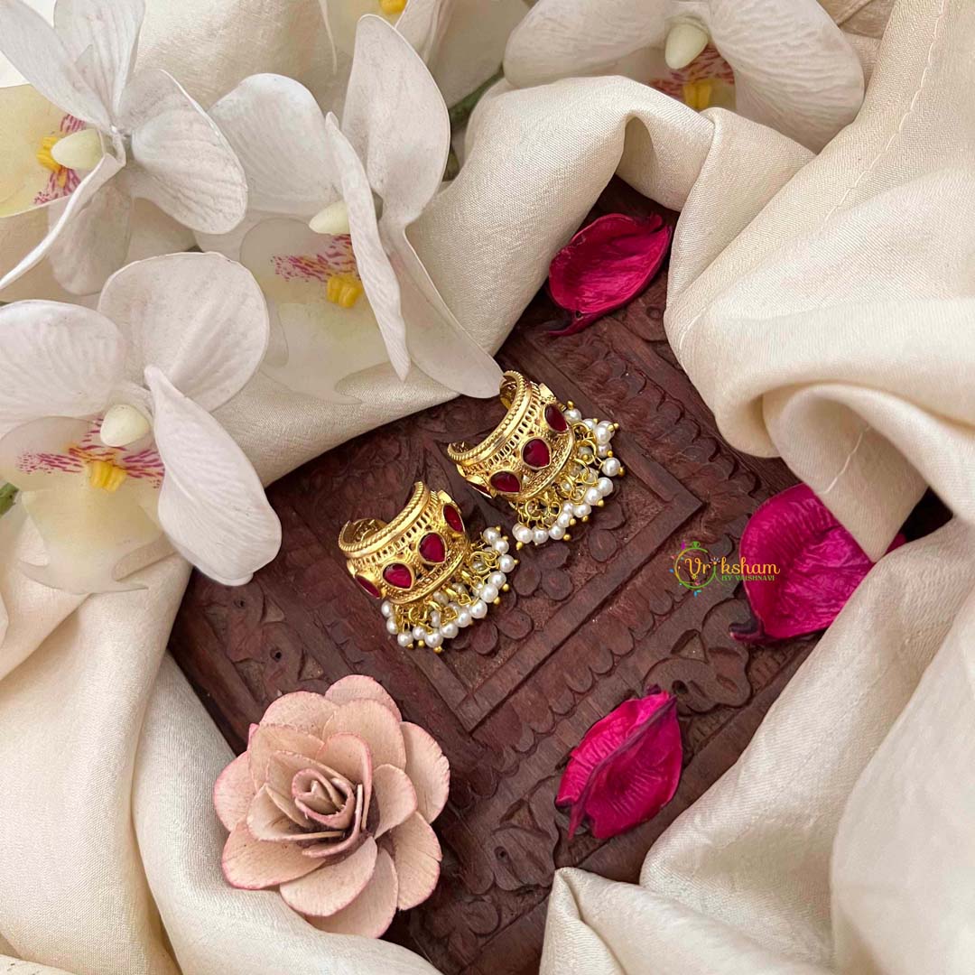 Adorn yourself with these magnificent kundan jadau earrings, where pearl clusters dangle gracefully from meticulously crafted gold frameworks. The elegant bugadi design in deep crimson showcases the finest traditions of Indian jewelry artistry, with each piece featuring intricate gemstone settings and luminous pearl accents. The rich red tone evokes regal sophistication and timeless beauty, making these earrings an ideal choice for weddings, festivals, and formal celebrations. Handcrafted with precision and care, these drop earrings represent a harmonious blend of cultural heritage and refined elegance, perfect for those who appreciate authentic artisanal craftsmanship.