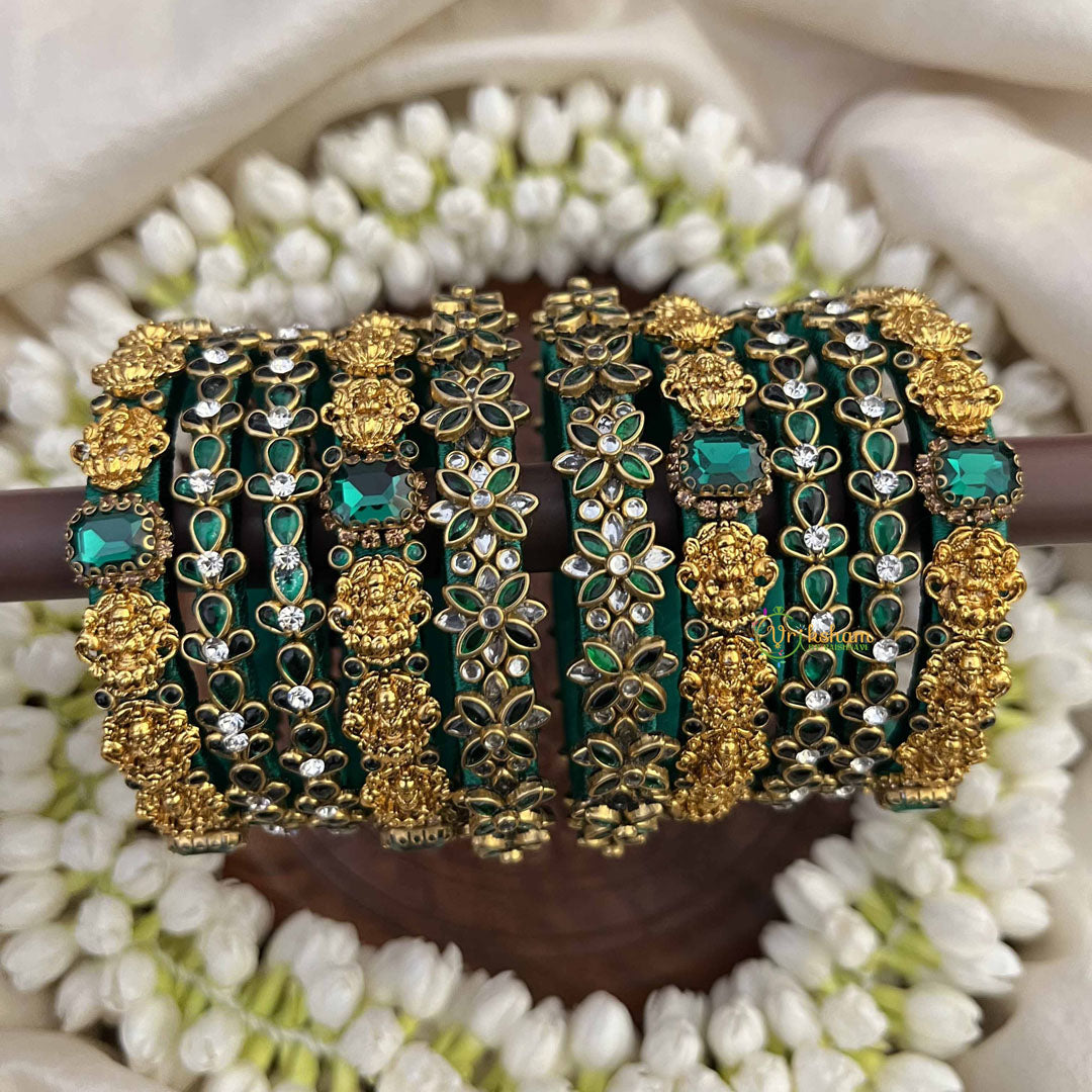Celebrate timeless elegance with this exquisite bridal bangle set, featuring intricate Lakshmi and floral leaf motifs in lustrous gold. The sophisticated design seamlessly blends traditional craftsmanship with contemporary aesthetics, while the rich green accents add a vibrant touch of grace. Each bangle is meticulously crafted to complement your bridal ensemble, radiating opulence and cultural heritage. Perfect for weddings, festivals, and special occasions, this set embodies the divine beauty of prosperity and femininity. An heirloom-worthy piece that transforms any celebration into a moment of splendor.
