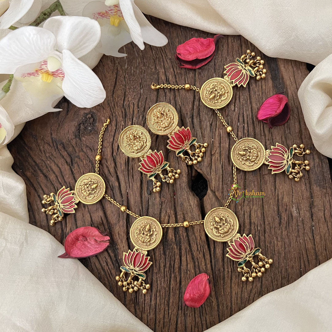 Elevate your traditional ensemble with the Vriksham Elegant Gold Look Alike Lakshmi Coin with Lotus Short Neckpiece. Featuring a finely crafted Lakshmi coin pendant adorned with delicate lotus motifs, this piece exudes timeless grace. Its rich gold-like finish offers the allure of classic elegance without the weight, making it perfect for festive occasions or sophisticated gatherings. Designed to sit gracefully around the neck, it complements both ethnic and contemporary styles with subtle opulence.