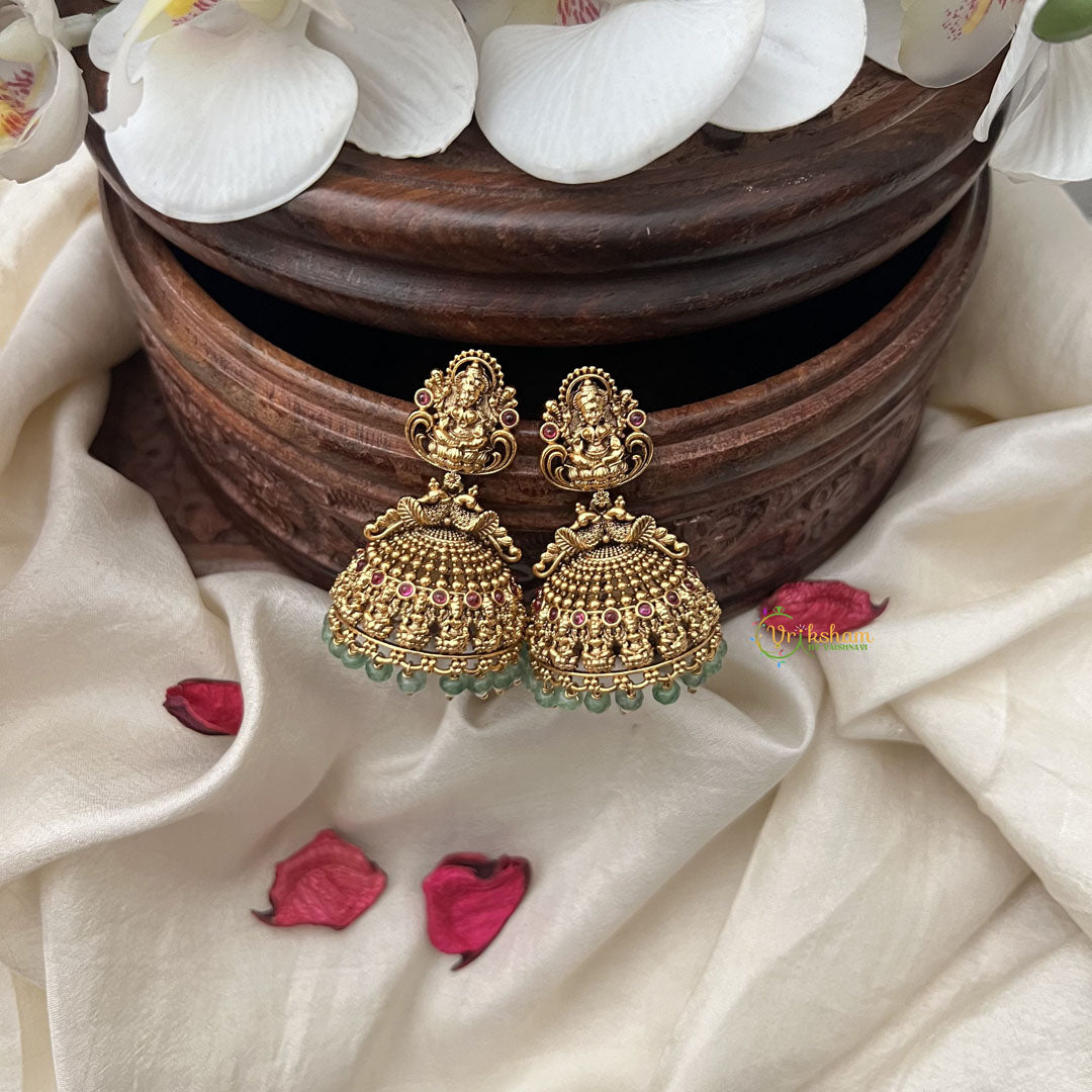 Immerse yourself in divine elegance with our Vriksham Gold Look Alike Laksmhi Jhumka. These refined earrings feature an intricate Laksmhi motif, symbolizing prosperity and grace, delicately enhanced with luminous pastel green beads. The premium gold-tone finish offers a luxurious aesthetic while maintaining lightweight comfort. Perfect for cultural celebrations or adding a touch of traditional sophistication to contemporary ensembles.