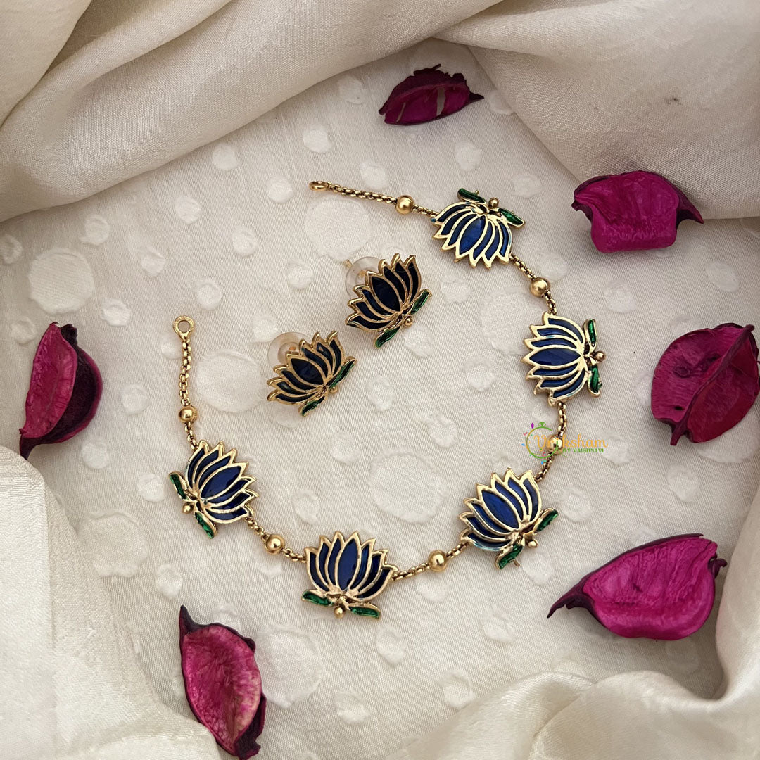 This distinguished Vriksham neckpiece features a captivating lotus design with a refined gold-like finish, accentuated by elegant blue detailing. The short length creates a perfect frame for the décolletage, offering a sophisticated presence without overwhelming. Meticulously crafted to emulate the opulence of gold while maintaining a contemporary aesthetic, this piece transitions effortlessly from daytime refinement to evening elegance.