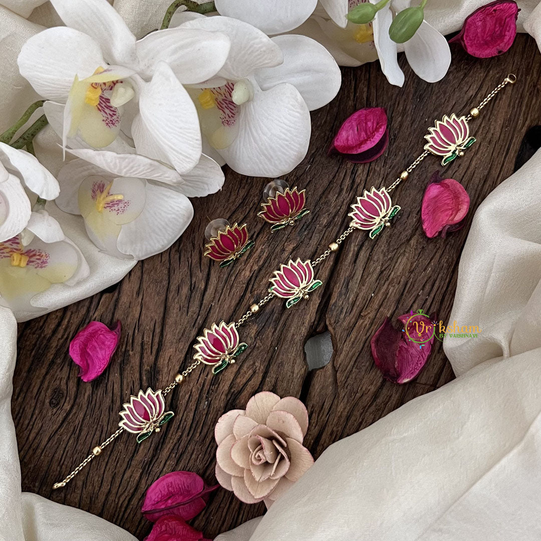 Indulge in luxury with the Vriksham Elegant Gold Look Alike Lotus Short Neckpiece. Crafted to perfection, this exquisite neckpiece features a delicate lotus design, symbolizing purity and beauty. Elevate your style with this elegant accessory, perfect for any occasion.