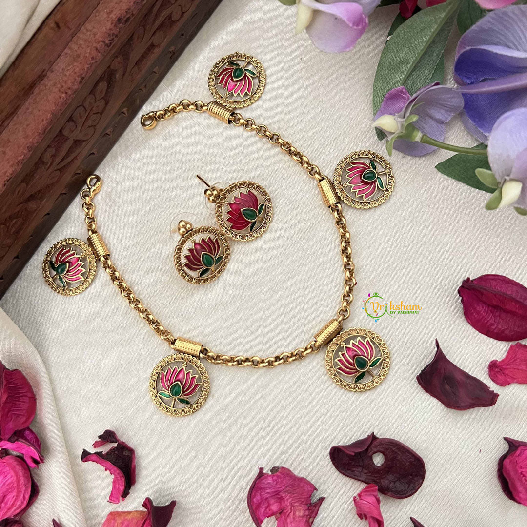 The Vriksham Elegant Gold Look Alike Short Neckpiece showcases a delicate pink lotus paired with graceful green leaves, creating a harmonious and refined design. Its gold-like finish adds a touch of timeless elegance, perfect for elevating your formal or festive attire. This piece brings subtle color and sophistication to your neckline, making it an exquisite accessory for any occasion.