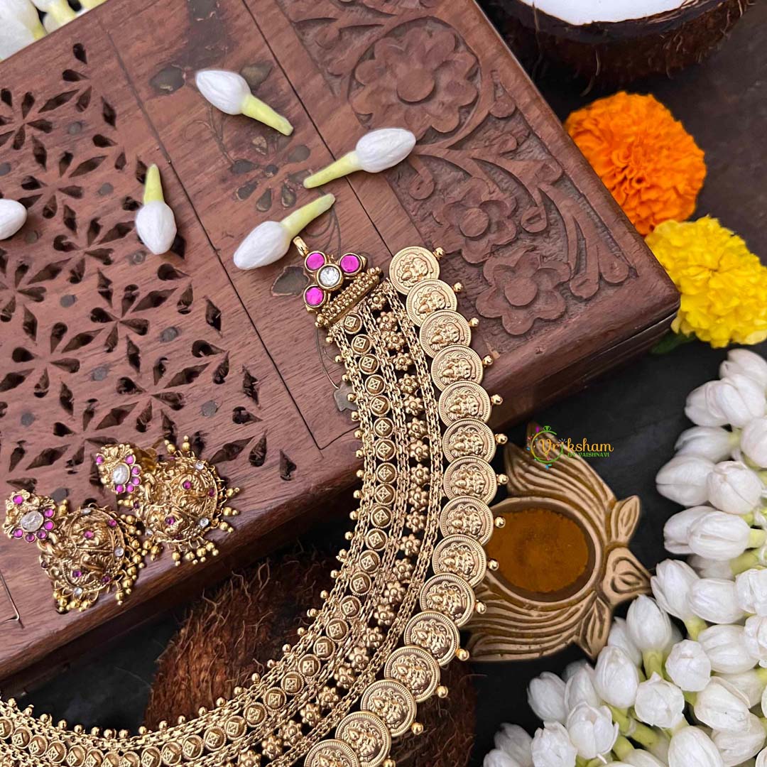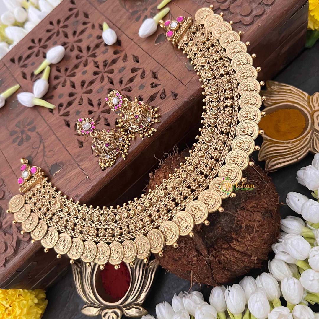 Embrace divine elegance with this exquisite Lakshmi Coin Short Neckpiece, crafted to radiate timeless sophistication. Featuring a lustrous gold-look finish, the sacred Lakshmi coin pendant symbolizes prosperity and grace, making it an ideal choice for both festive occasions and everyday wear. The refined short length offers versatile styling options, complementing traditional and contemporary ensembles with equal poise. Perfect for those who appreciate meaningful jewelry that combines spiritual significance with refined aesthetics.