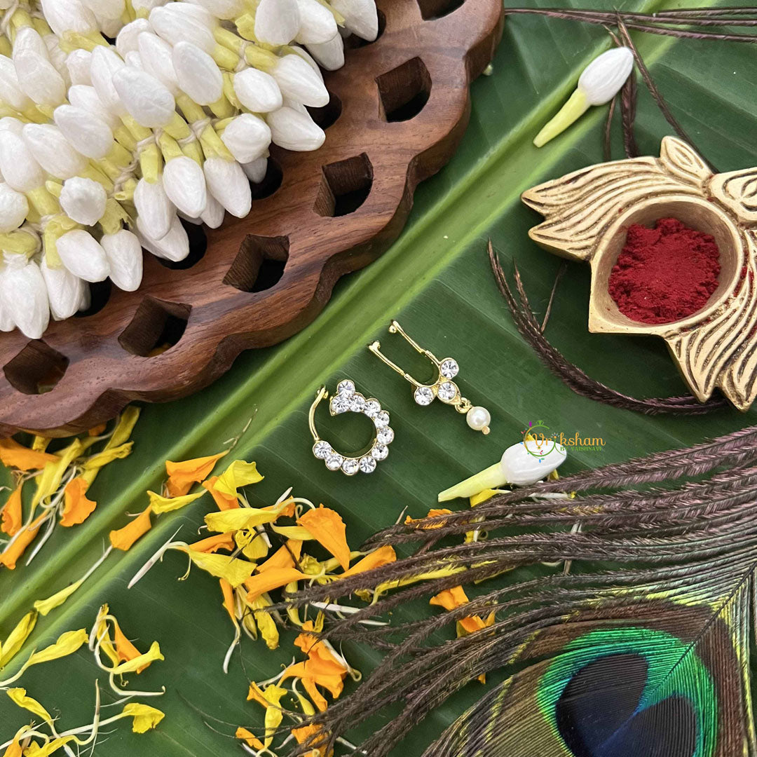 Enhance your traditional look with the Elegant Gold Polish Precious Kemp Nath and Bullaku featuring pristine white pearls. The polished gold finish beautifully complements the delicate pearl accents and vibrant Kemp stones, offering a harmonious blend of classic charm and sophistication. This exquisite set is perfect for elevating any ceremonial or festive attire with subtle elegance.
