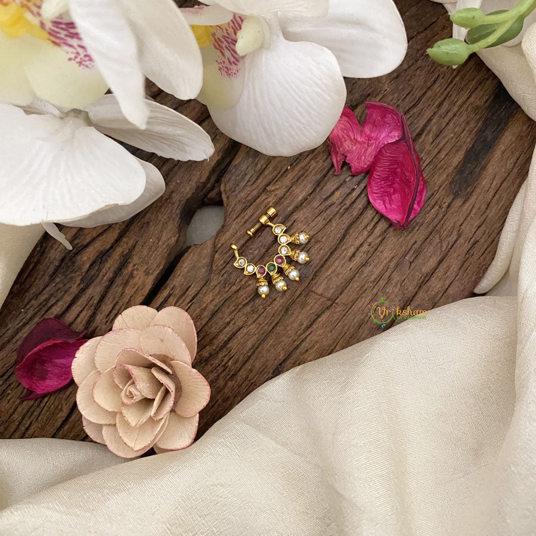 Embrace the elegance of Vriksham's Golden Look Alike Naths, featuring a stunning pearl-red white & green design. Experience the opulence and sophistication of this nose pin, perfect for adding a touch of luxury to any outfit. Elevate your style with Vriksham's premium product, fit for a connoisseur of beauty and refinement.