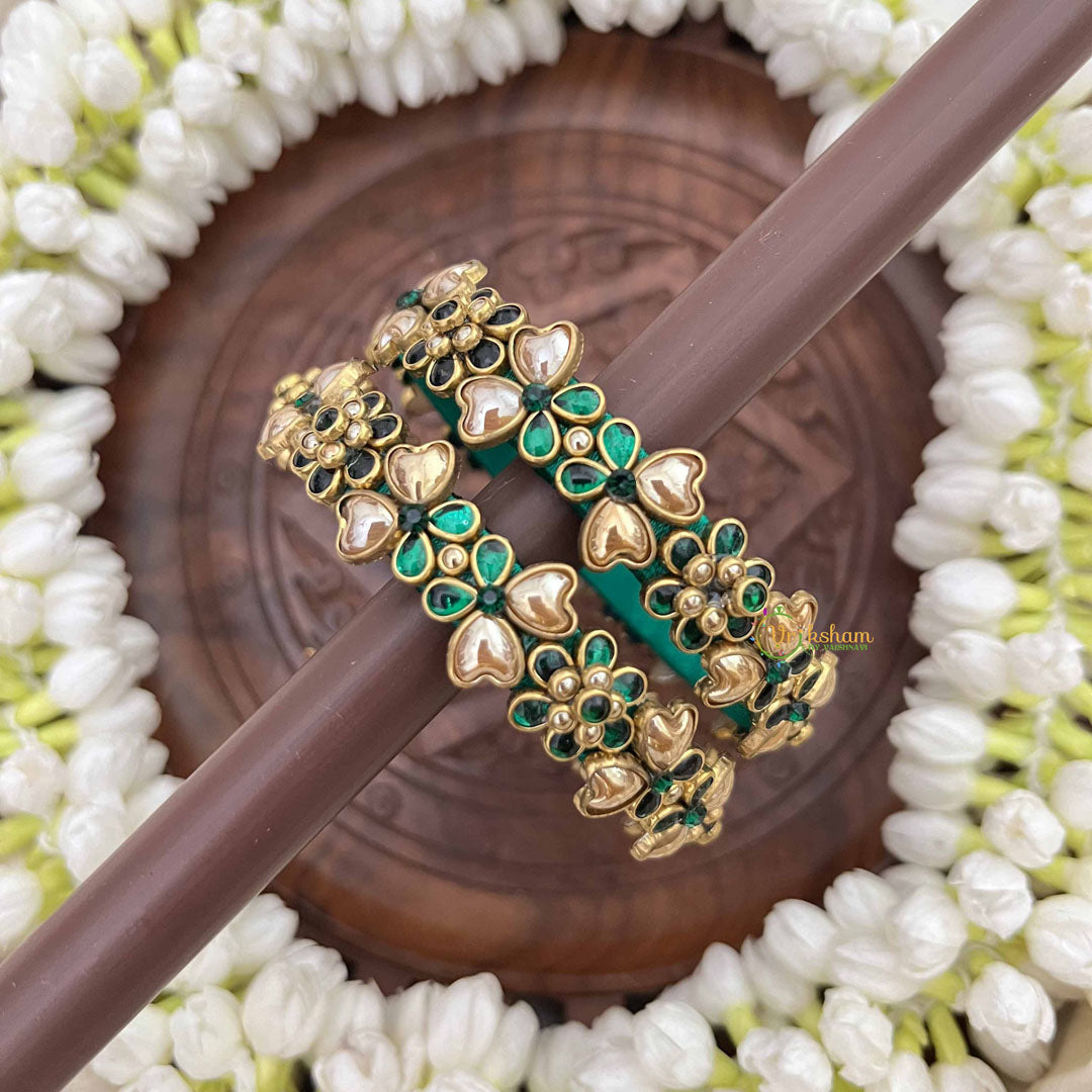 Discover refined elegance with these stunning Green Emerald bangles, where verdant beauty harmonizes with golden accents. Each bangle showcases delicate floral motifs enhanced by shimmering emerald stones that evoke natural splendor and timeless grace. The subtle golden touches add a luxurious dimension, creating a sophisticated interplay of color and light. Expertly designed for the discerning wearer, these pieces transition seamlessly from festive occasions to refined everyday wear. Celebrate your individuality with jewelry that captures the essence of botanical beauty and understated opulence.