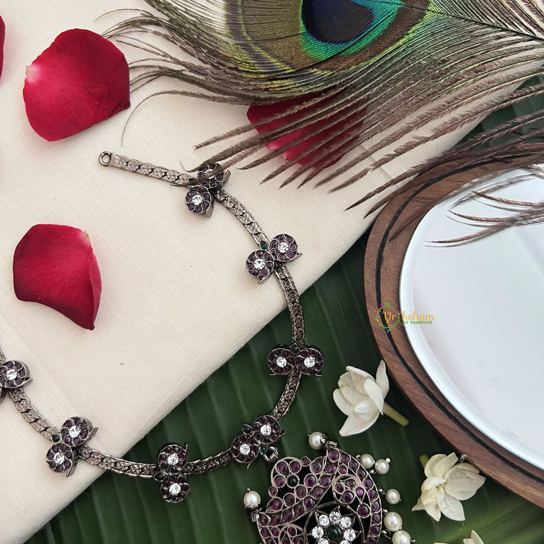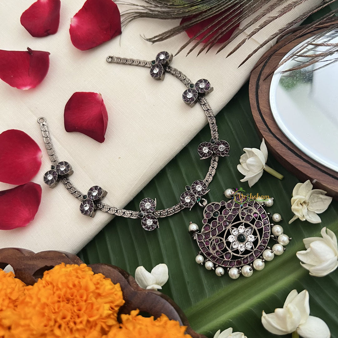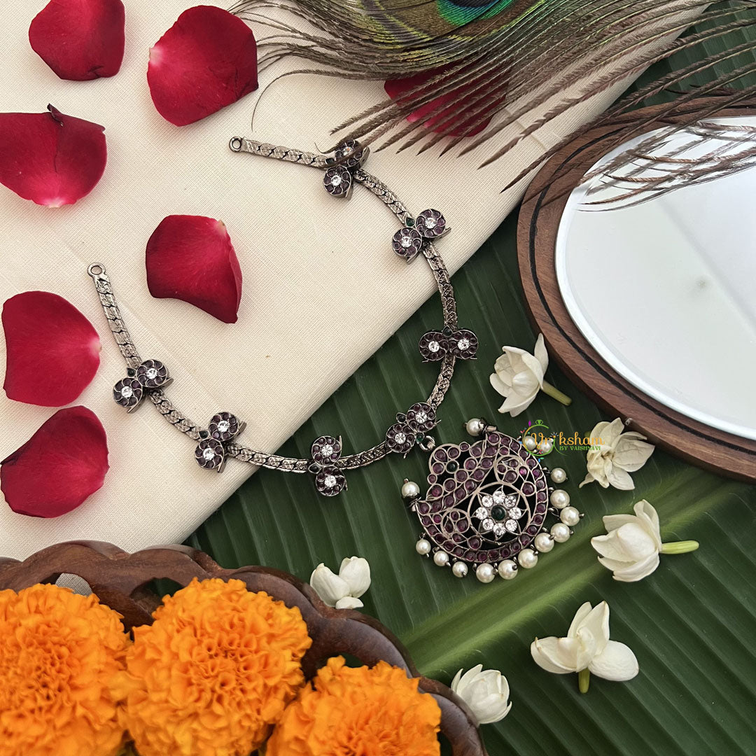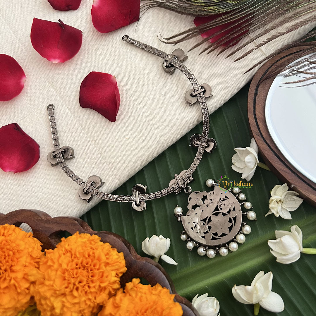 The Vriksham Elegant Half Moon Black Kemp Stone Pendant Short Neckpiece features a striking black Kemp stone set in a graceful half-moon design, complemented by delicate pearls. This sophisticated piece offers a refined touch to any outfit, perfect for adding understated elegance to both traditional and contemporary looks.